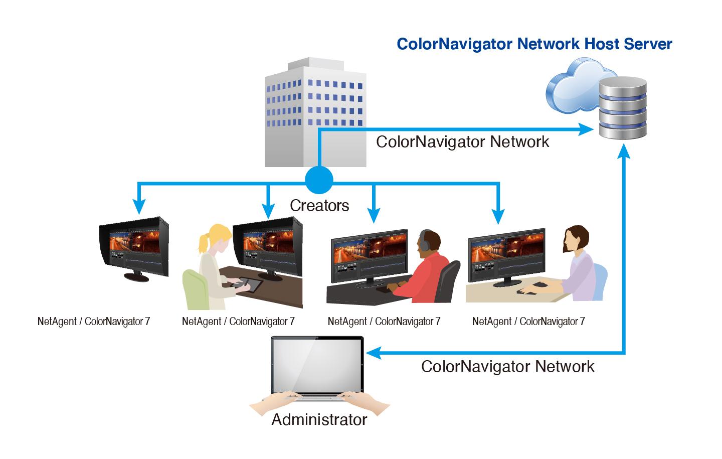 ColorNavigator Network provides centralized quality control (QC) of ColorEdge monitors for studios, printing houses, and other enterprises with multiple creators and editors who work on shared projects. With NetAgent or ColorNavigator 7 installed on the workstation, administrators can manage multiple ColorEdge monitors via web browser enabling quality control even from remote locations. ColorNavigator Network is hosted on a secure cloud server to free you from the initial investment and running costs of providing your own server.
