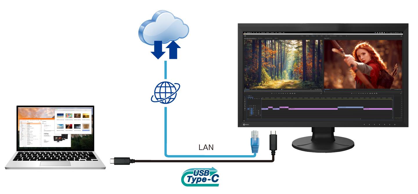 While many modern laptops are not equipped with a dedicated LAN port, the monitor has one directly built in for stable wired connection. Connecting a laptop via USB Type-C provides access to the network through the monitor for sharing creative assets and files, carrying out post production work remotely, and enables network-based color management via ColorNavigator Network.