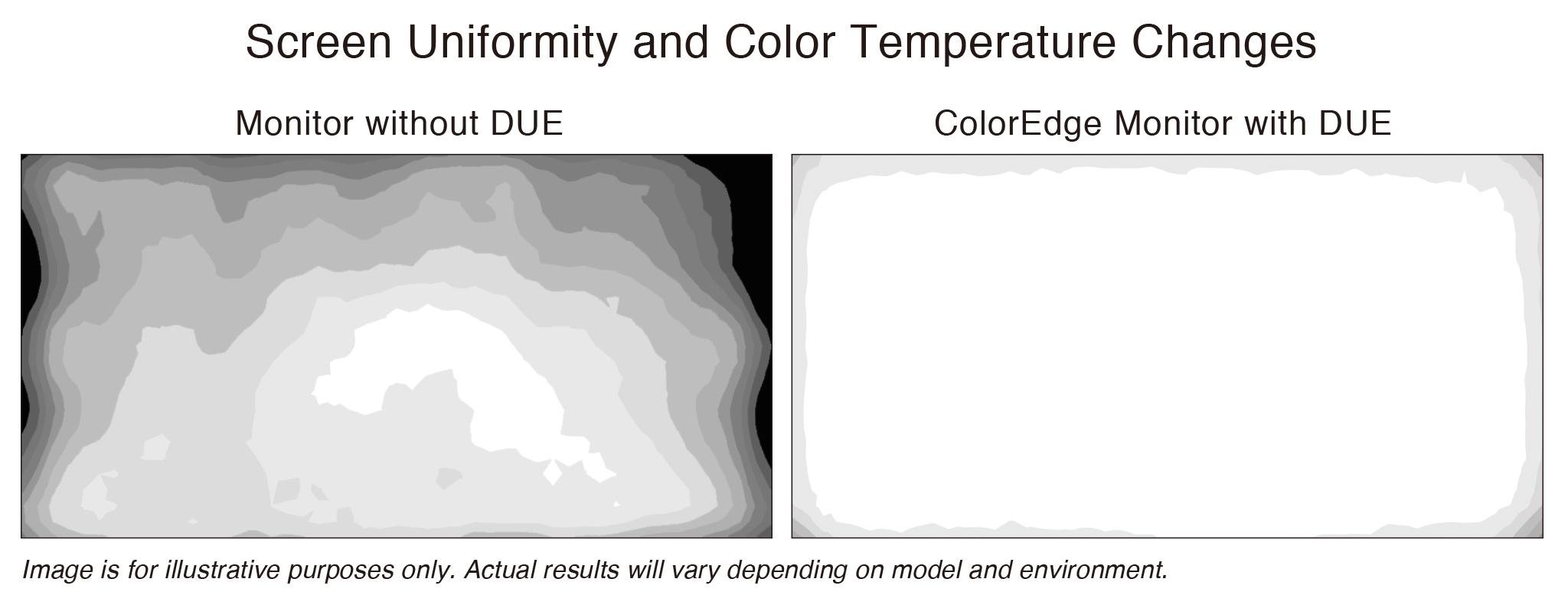 LCD monitors commonly exhibit fluctuations in brightness and chromaticity across the screen, affecting color accuracy. To counter this, ColorEdge monitors are equipped with EIZO's patented digital uniformity equalizer (DUE) technology which corrects deviations in every tone across the screen to ensure stable display.