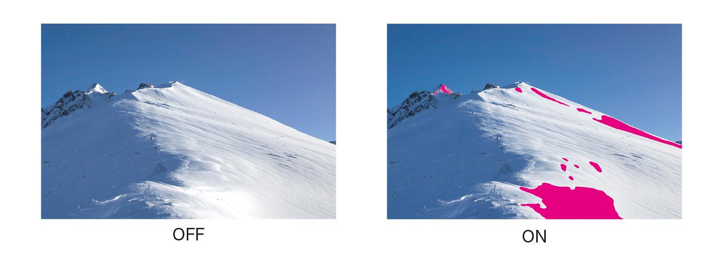 The monitor includes a function that shows the areas of the image that cannot be displayed correctly at the current brightness settings. These areas are marked in yellow or magenta and can be viewed for brightness levels of 300, 500, 1000, and 4000 cd/m2.