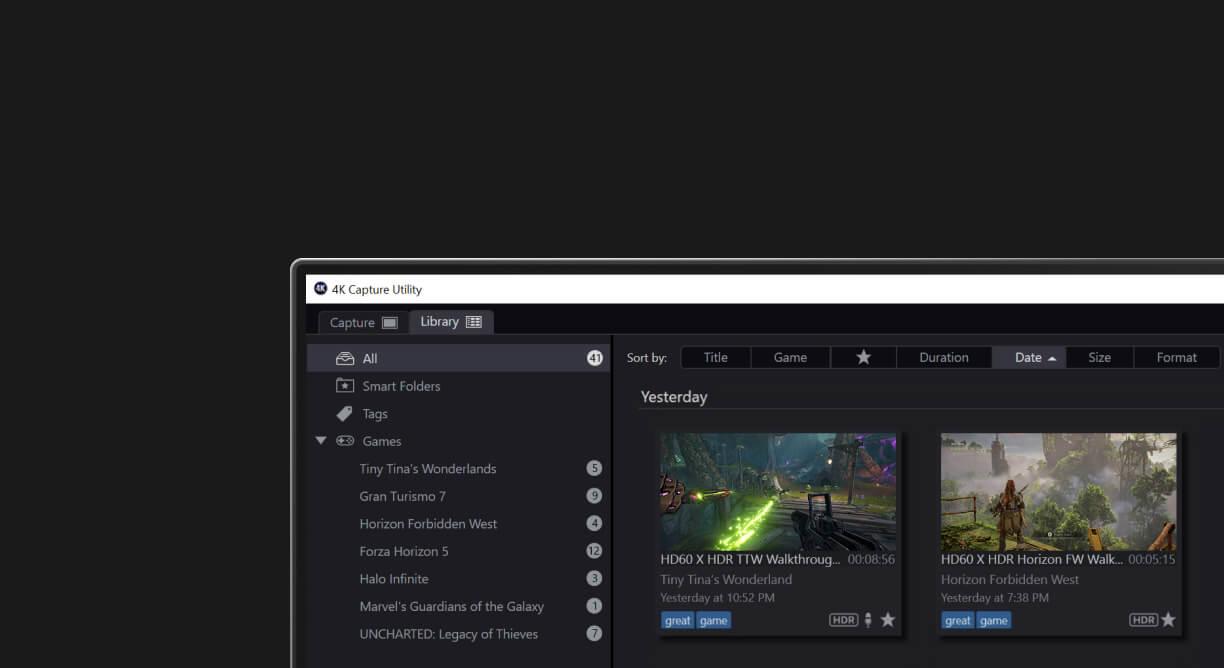 Capture your entire experience in stunning 1080p60 HDR10 or 4K30 quality with pristine 48kHz audio. Without watermarks or time limits.