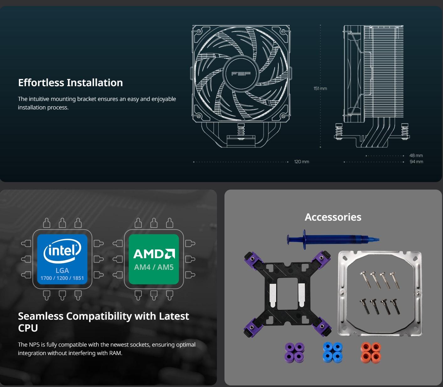 | CPU Supported Platforms | Intel LGA : 1851 / 1700 / 1200 (The installation method for 1851 is the same as for 1700) AMD : AM4 / AM5 |