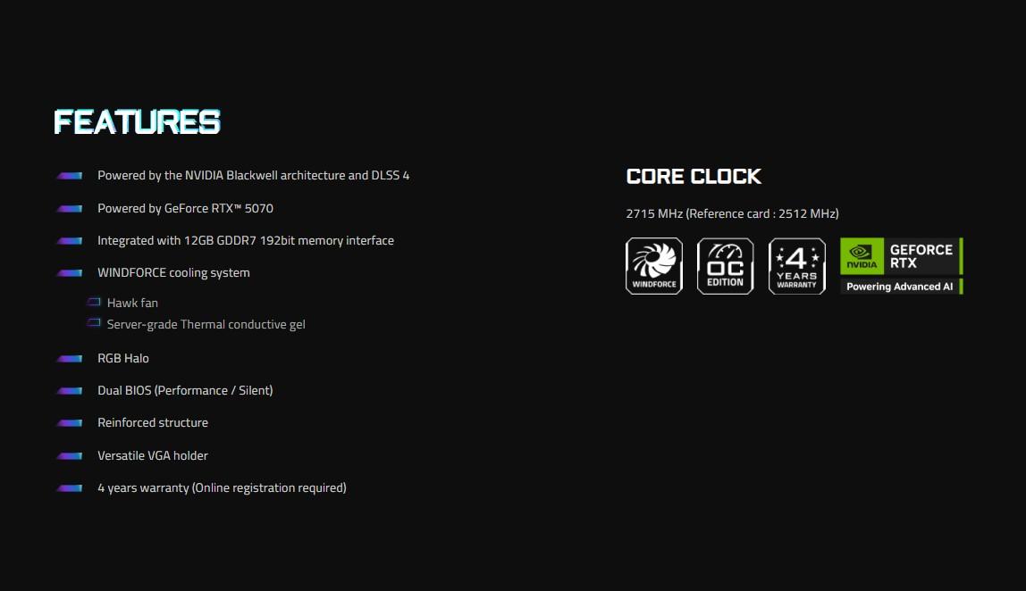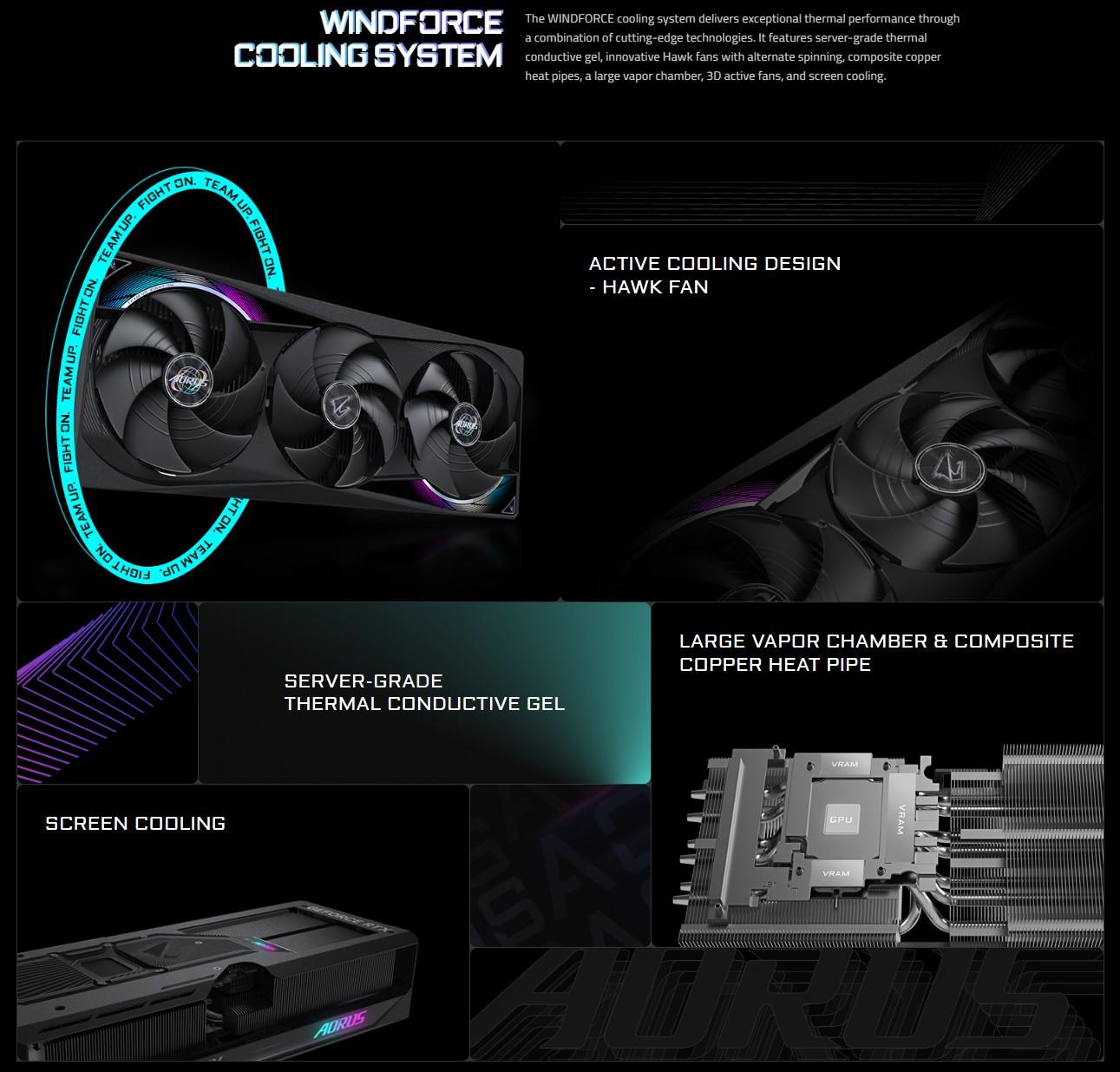 - Sistem de racire WINDFORCE: Include ventilatoare Hawk, camera de vapori, heatpipe-uri compozite si gel termic de nivel server pentru disipare eficienta.