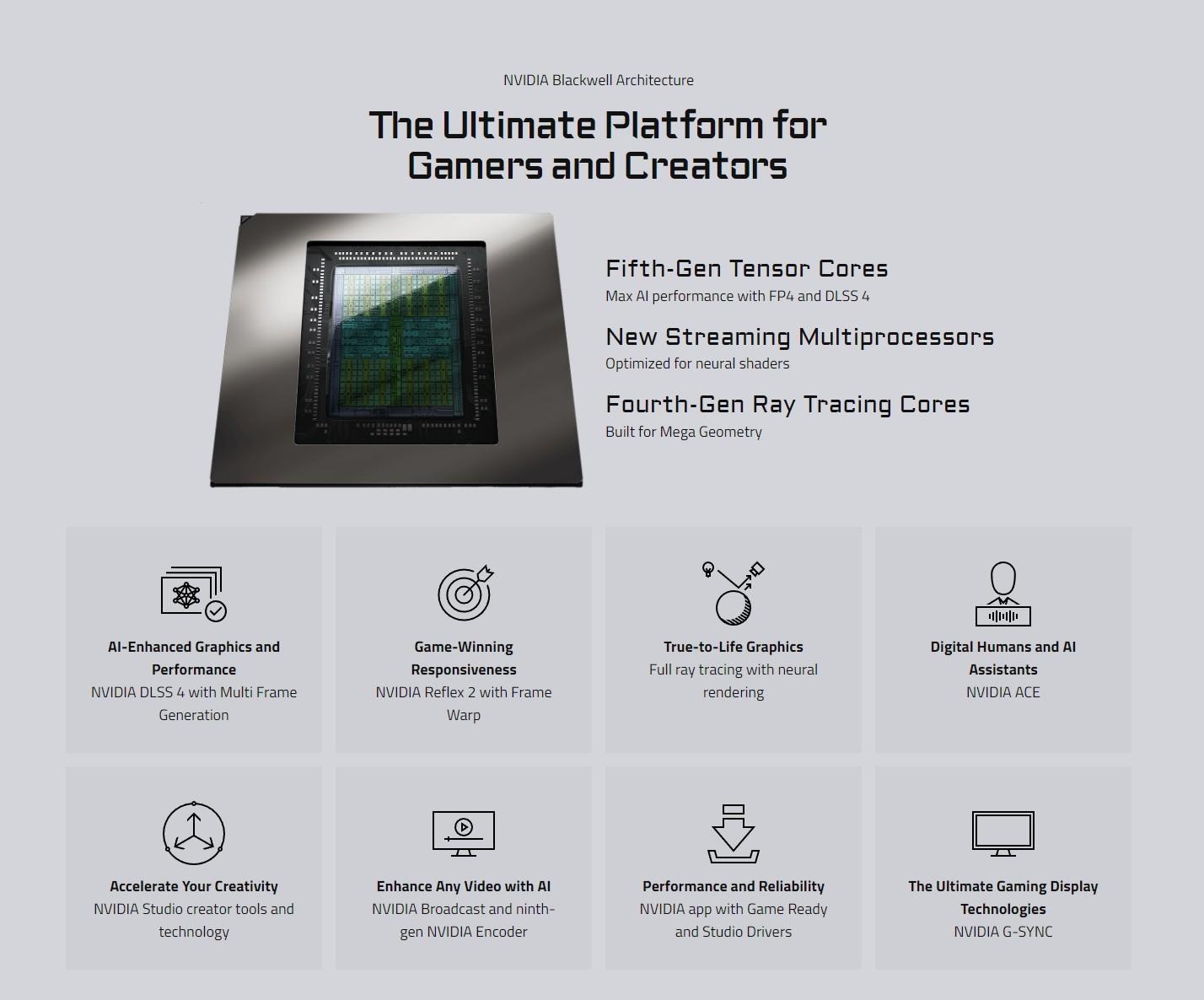 - Tehnologii NVIDIA: DLSS 4 cu Multi Frame Generation, Reflex 2 cu Frame Warp, ACE pentru asistenti digitali si suport complet pentru DirectX 12 Ultimate