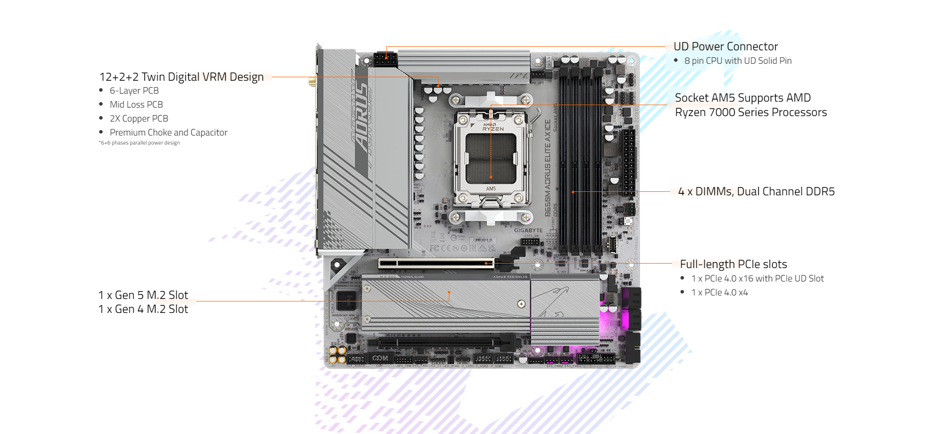 - Dual Channel DDR5:4*DIMMs with AMD EXPO & Intel XMP Memory