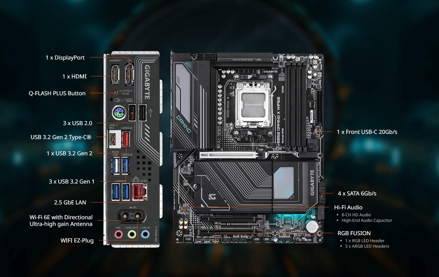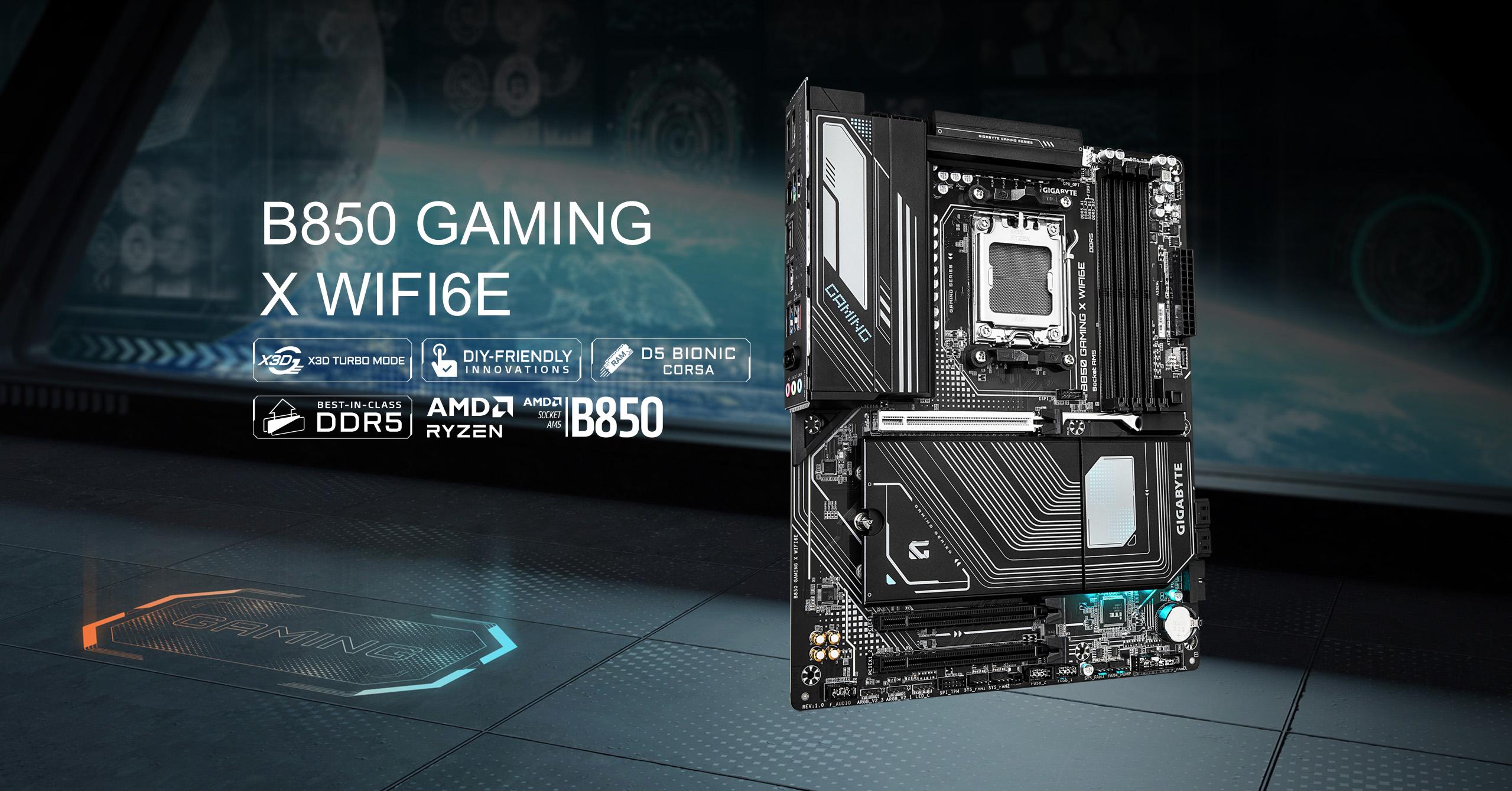 GIGABYTE B850 GAMING X WIFI6E este o placa de baza ATX moderna, construita pe chipsetul AMD B850 si socket AM5, ideala pentru gaming si creatie. Cu suport pentru DDR5, PCIe 5.0 si conectivitate Wi-Fi 6E, ofera performanta ridicata, stabilitate si flexibilitate pentru sistemele actuale si viitoare.