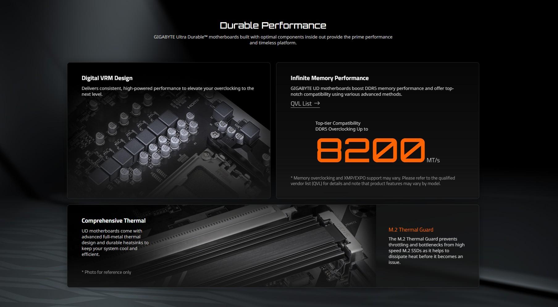 | Memory | Support for DDR5 8200(O.C) / 8000(O.C) / 7950(O.C) / 7900(O.C) / 7800(O.C) / 7600(O.C.) / 7400(O.C.) / 7200(O.C.) / 7000(O.C.) / 6800(O.C.) / 6600(O.C.) / 6400(O.C) / 6200(O.C) / 6000(O.C) / 5800(O.C) / 5600(O.C) / 5200 / 4800 / 4400 MT/s memory modules. 4 x DDR5 DIMM sockets supporting up to 256 GB (64 GB single DIMM capacity) of system memory Dual channel memory architecture Support for non-ECC Un-buffered DIMM 1Rx8/2Rx8/1Rx16 memory modules Support for AMD EXtended Profiles for Overclocking (AMD EXPO) and Extreme Memory Profile (XMP) memory modules (The CPU and memory configuration may affect the supported memory types, data rate (speed), and number of DRAM modules, please refer to "Memory Support List" on GIGABYTE's website for more information.) |