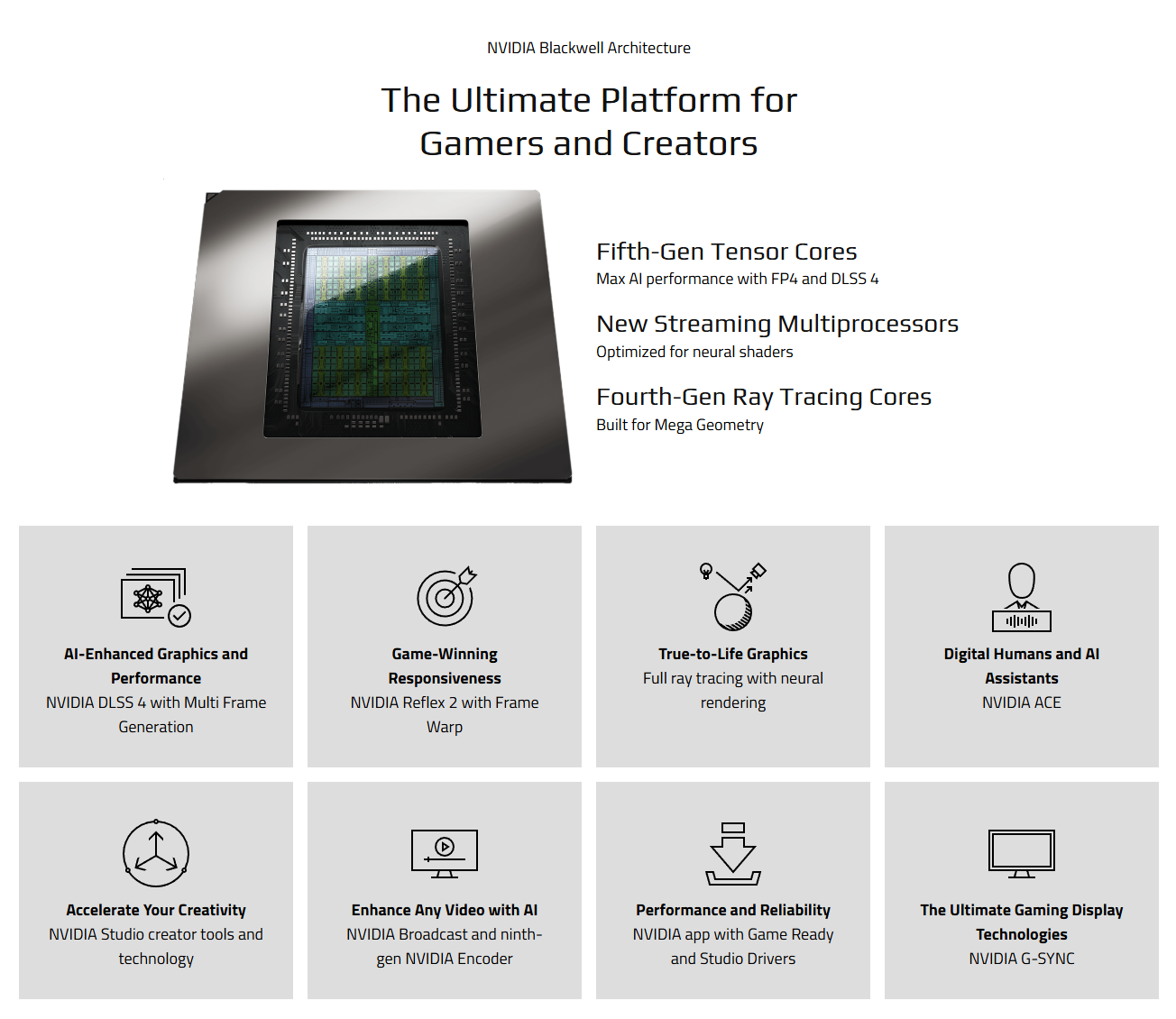 - Tehnologii NVIDIA: DLSS 4 cu Multi Frame Generation, Reflex 2 cu Frame Warp, ACE pentru asistenti digitali si suport complet pentru DirectX 12 Ultimate