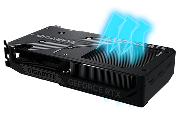 The copper plate directly contacts the GPU, coupled with the composite copper heat pipes, which quickly transfers the heat of the GPU and VRAM to the heatsink.