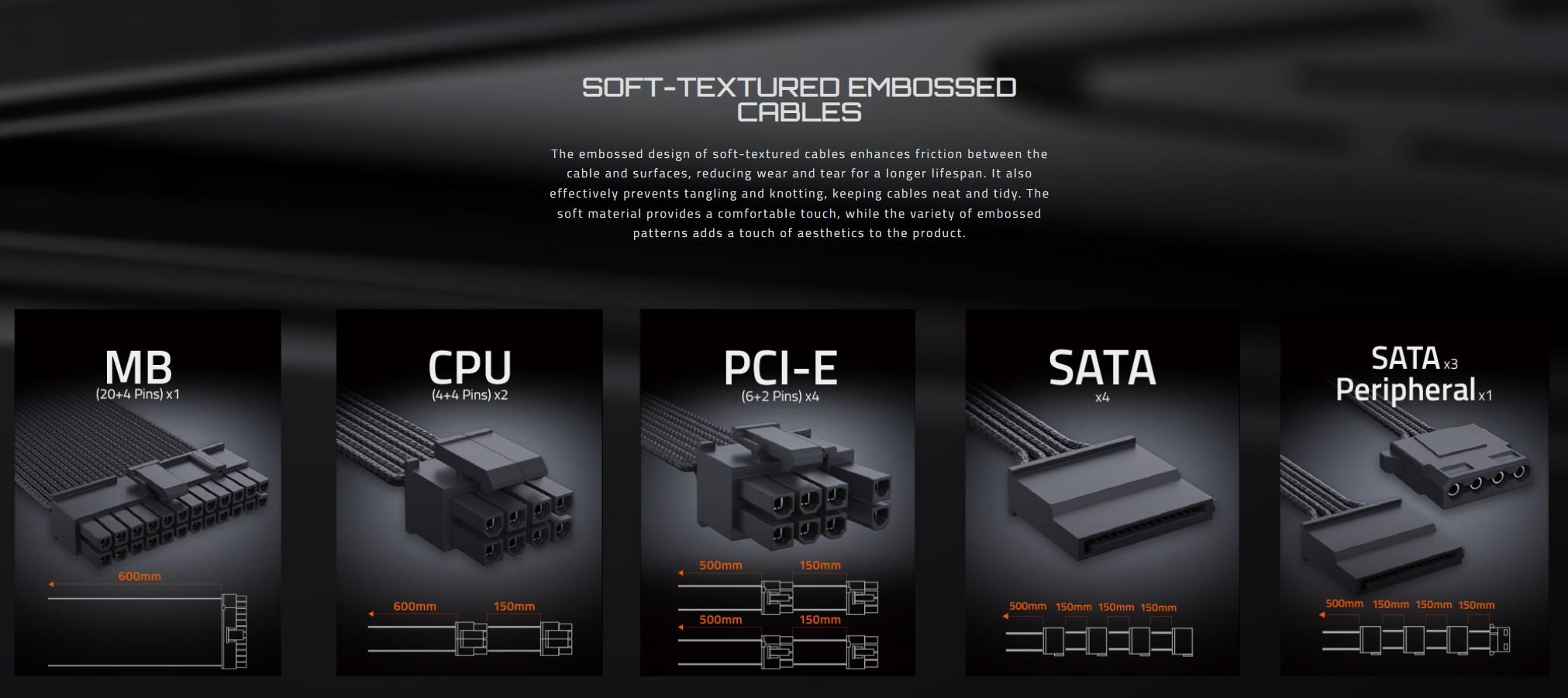 | Connectors | ATX/MB 20+4 Pin x 1 : 600mm*1 CPU/EPS 4+4 Pin x 2 : 600mm+150mm*1 PCI-E 6+2 Pin x 4 : 500mm+150mm*2 SATA x 4 : 500mm+150mm+150mm+150mm*1 SATA x 3 + Peripheral x1 : 500mm+150mm+150mm+150mm*1 |