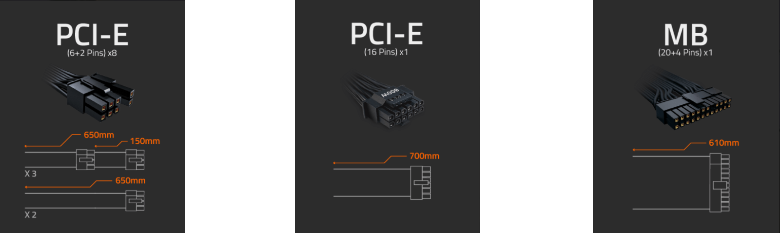 ATX/MB 20+4 Pin x 1 : 610mm*1 CPU/EPS 4+4 Pin x 2 : 650mm*2 PCIe 16 Pin x 1: 700mm*1 PCIe 6+2 Pin x 8 : 650mm+150mm*3, 650mm*2 SATA x 12 : 650mm+150mm+150mm+150mm*3 4 Pin Peripheral x 6+4-Pin floppy x 2 : 600mm+150mm+150mm+150mm*2 |