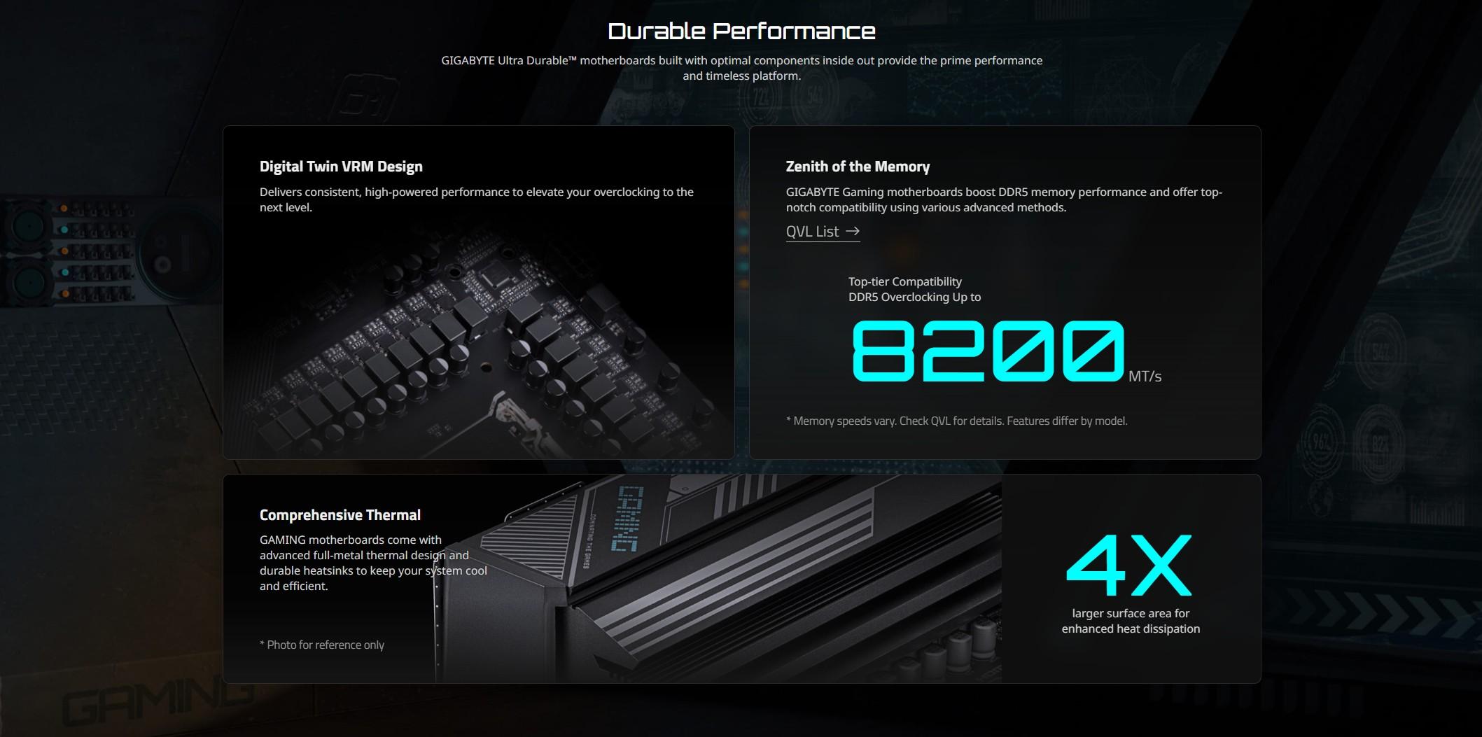 | Memory | Support for DDR5 8200(OC) / 8000(OC) / 7800(OC) / 7600(OC) / 7200(OC) / 7000(OC) / 6800(OC) / 6666(OC) / 6600(OC) / 6400(OC) / 6200(OC) / 6000(OC) / 5600(OC) / 5200 / 4800 / 4400 MT/s memory modules 4 x DDR5 DIMM sockets supporting up to 256 GB (64 GB single DIMM capacity) of system memory Dual channel memory architecture Support for non-ECC Un-buffered DIMM 1Rx8/2Rx8/1Rx16 memory modules Support for AMD EXtended Profiles for Overclocking (AMD EXPO) and Extreme Memory Profile (XMP) memory modules (The CPU and memory configuration may affect the supported memory types, data rate (speed), and number of DRAM modules, please refer to "Memory Support List" on GIGABYTE's website for more information.) |
