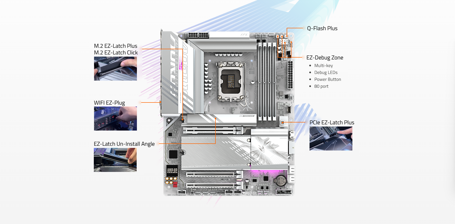 • EZ-Latch Plus : PCIe and M.2 slots with Quick Release & Screwless Design