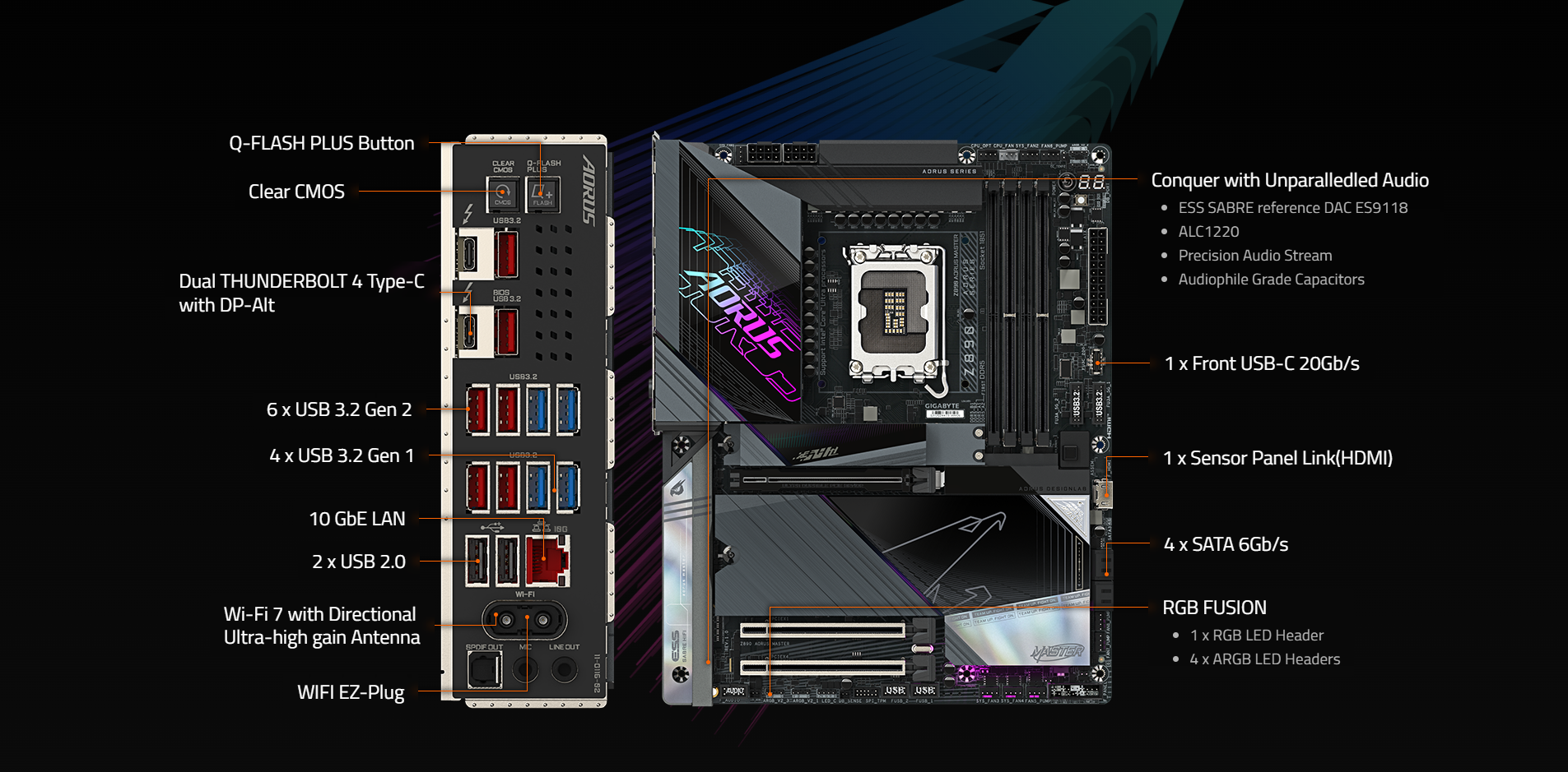 | Back Panel Connectors | 1 x Q-Flash Plus button 1 x Clear CMOS button 2 x Intel Thunderbolt 4 connectors (USB Type-C ports) 6 x USB 3.2 Gen 2 Type-A ports (red) 4 x USB 3.2 Gen 1 ports 2 x USB 2.0/1.1 ports 1 x RJ-45 port 2 x antenna connectors (2T2R) 2 x audio jacks 1 x optical S/PDIF Out connector |
