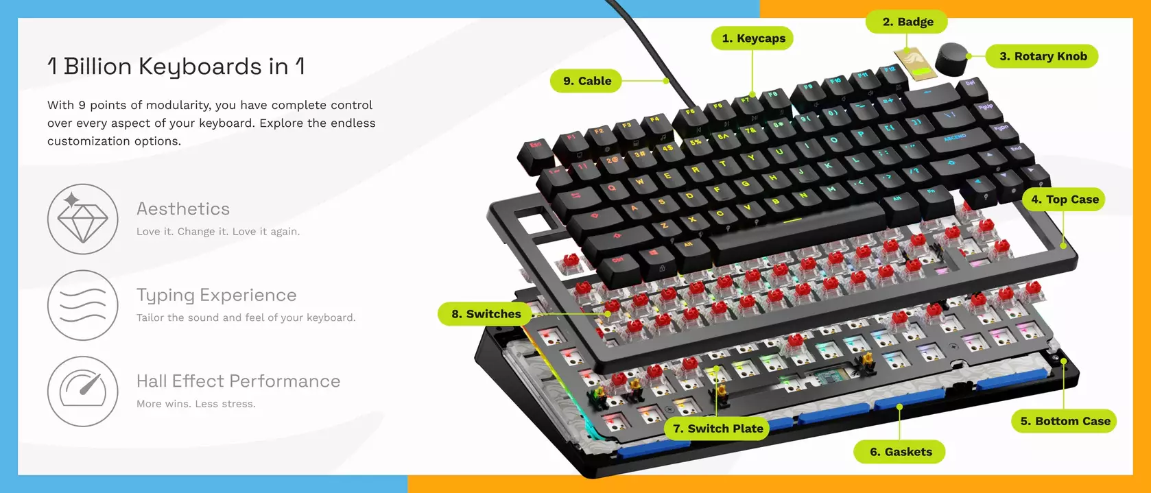 Switches define the sound and feel of your board. Pick your preferred switch tactility, acoustics, and resistance - then easily swap them out when you want to switch it up!