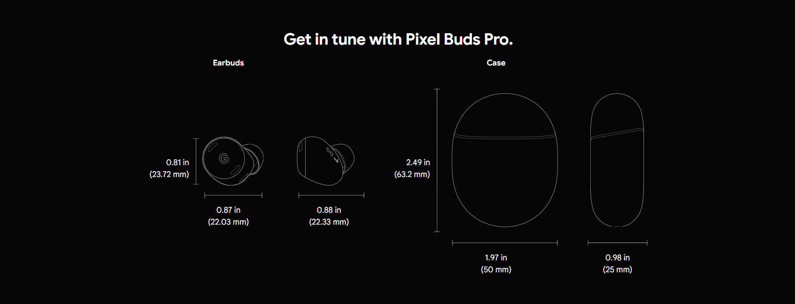 Each earbud: 0.88 x 0.87 x 0.93 in・22.33 x 22.03 x 23.72 mm Charging case: 0.98 x 1.97 x 2.49 in・25 x 50 x 63.2 mm |