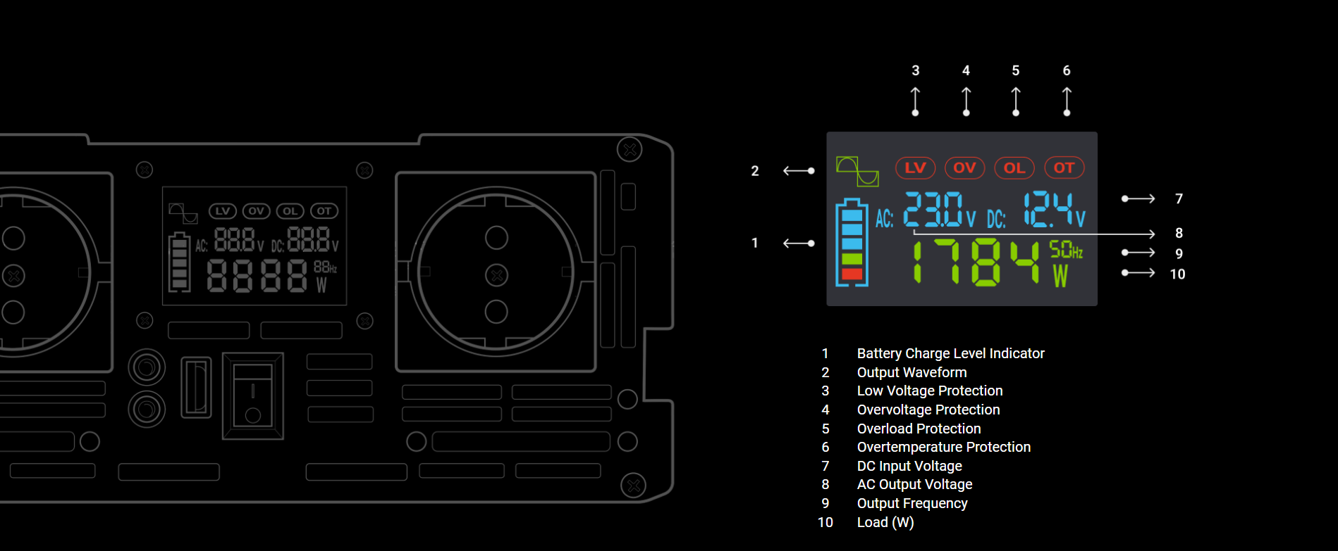 The inverter generates a full (otherwise pure) sinusoidal output current. This means that the current is the same as that in a 230 V "socket"