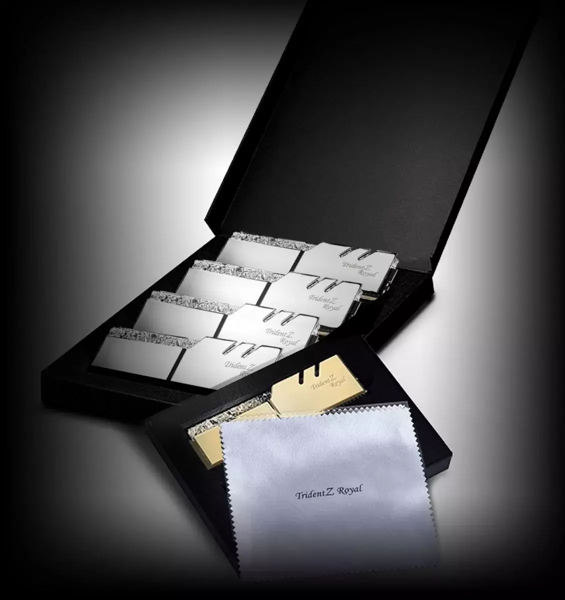Trident Z Royal is the newest member of the Trident Z family. Featuring a crown jewel design and meticulously crafted to display just the right amount of light refraction, the crystalline light bar scatters RGB colors in a magnificent display of LED lighting. Mirroring the high-class light bar design, polished aluminum heatspreaders of gold or silver colors cool the memory modules in the classic Trident Z tri-fin design.