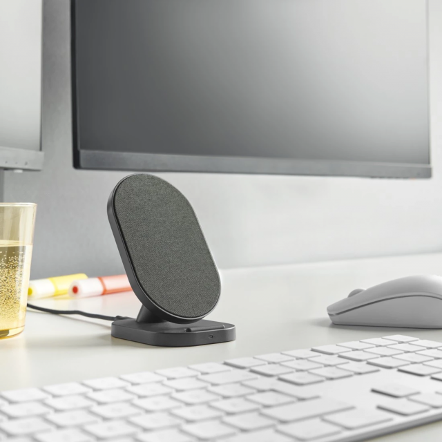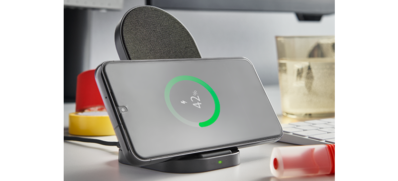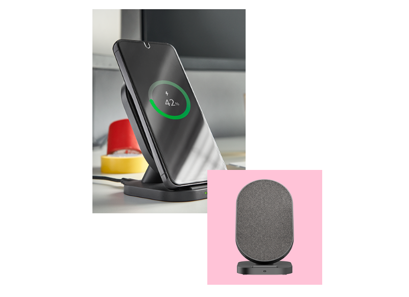 The Wireless Charger impresses not only as a practical desktop device without an irritating tangle of cables, but also looks really smart. The exclusive fabric rest with sophisticated finish also optimally protects the back of the smartphone from scratches. The practical stand feature lets you continue using your smartphone during the charging cycles so you can continue to be productive, watch videos and participate in a spontaneous Zoom call.