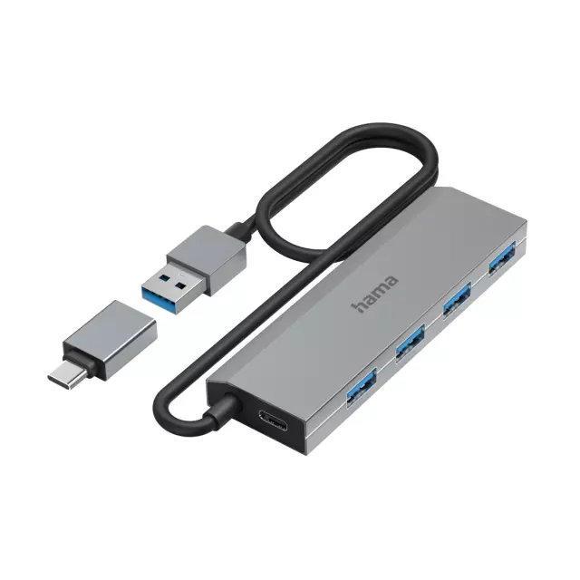 Hub cu 4 porturi HAMA, USB 3.2 Gen 1, 5 Gbit/s, adaptor USB-C inclus, alimentare automata