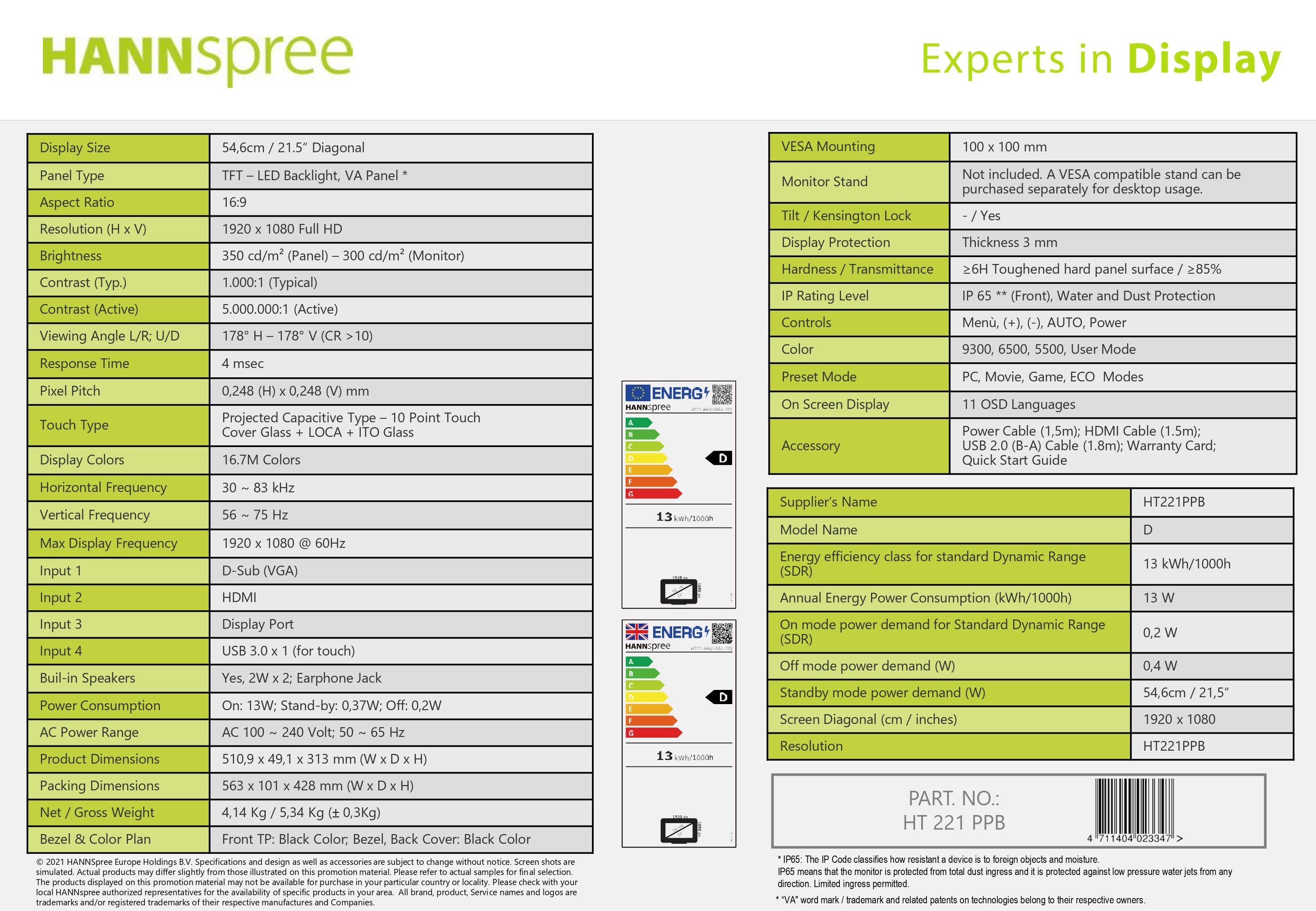 Monitor HANNSPREE HT221PPB, TFT, 21.5 inch, Wide, Full HD, D-Sub, USB-C, HDMI, DP, 10 Point Touch, Negru