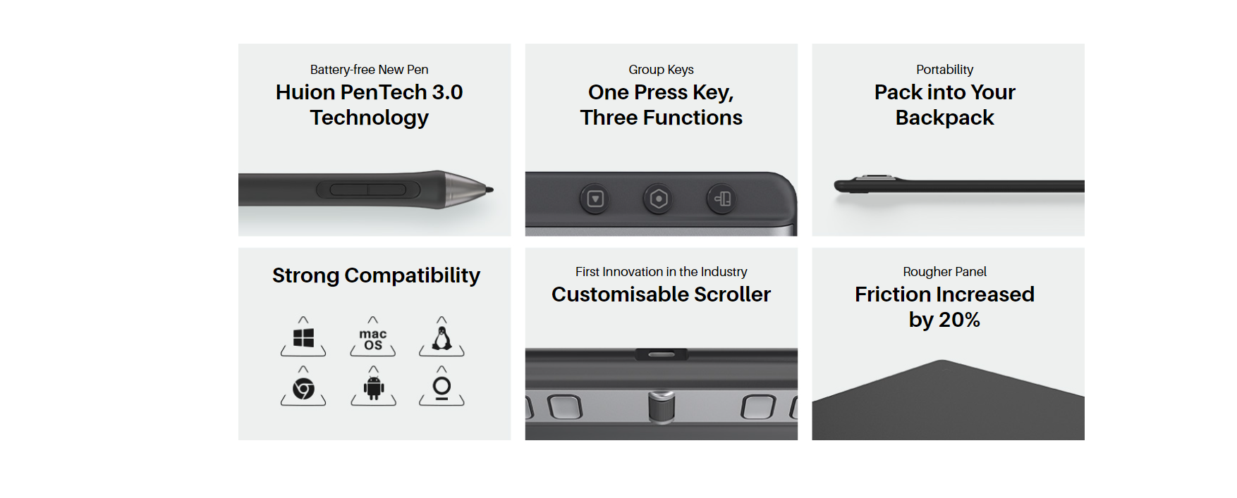 Inspiroy 2 narrows its width and keeps the overall thickness to less than 1cm, allowing you to easily pack the tablet into your backpack for drawing on the go. More importantly, the thinner body reduces wrist discomfort when creating. |