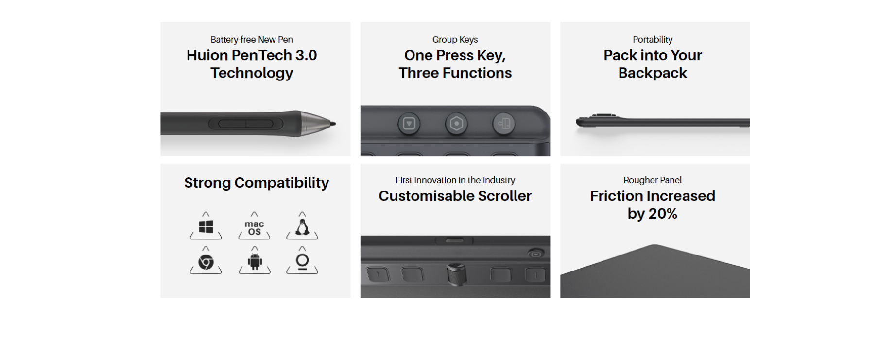 Inspiroy 2 narrows its width and keeps the overall thickness to less than 1cm, allowing you to easily pack the tablet into your backpack for drawing on the go. More importantly, the thinner body reduces wrist discomfort when creating. |