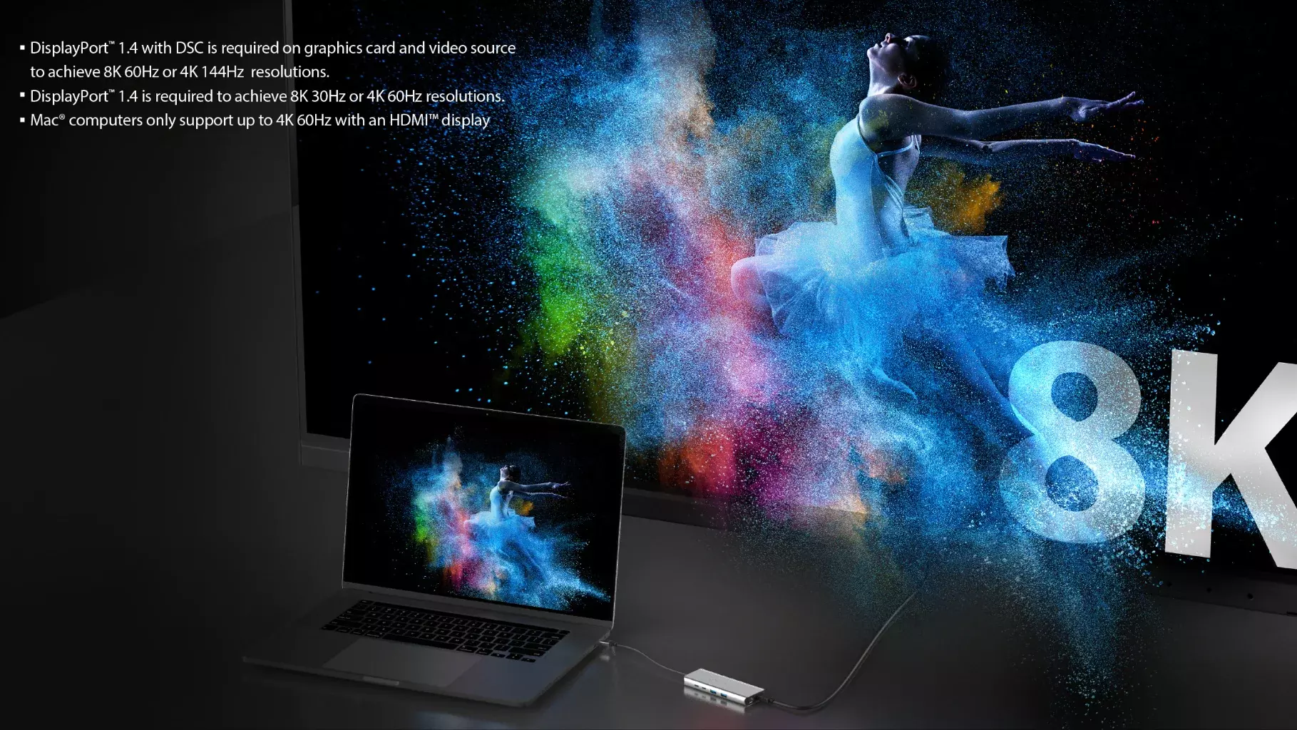Supports up to 8K60Hz and 4K144Hz for a high quality visual experience