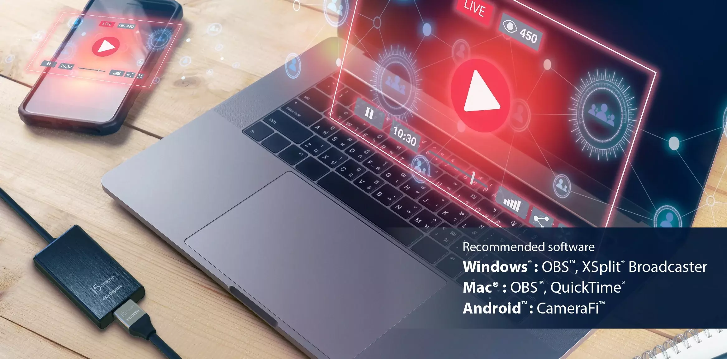 It works with OBS, XSplit, CameraFi, QuickTime, and other video streaming software.