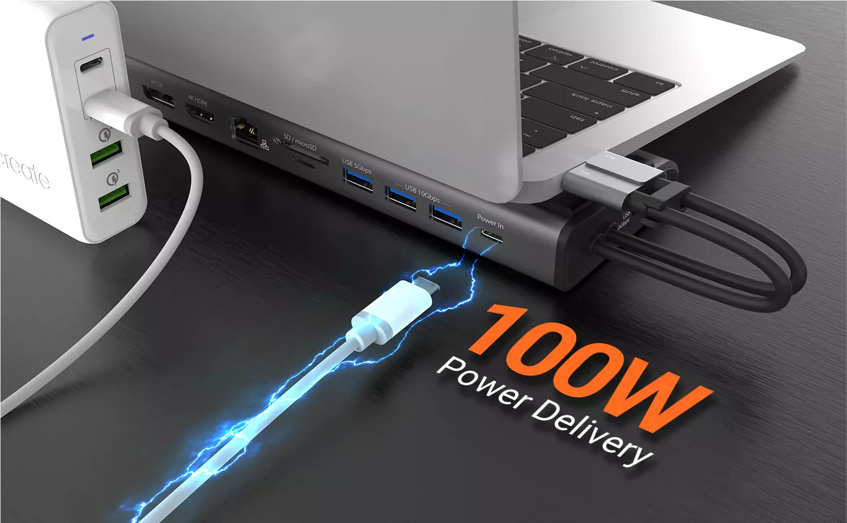 Laptop compatibil USB-C intr-o statie de lucru duala 4K cu pana la 10 Gbps. Acest doc de inalta performanta are un