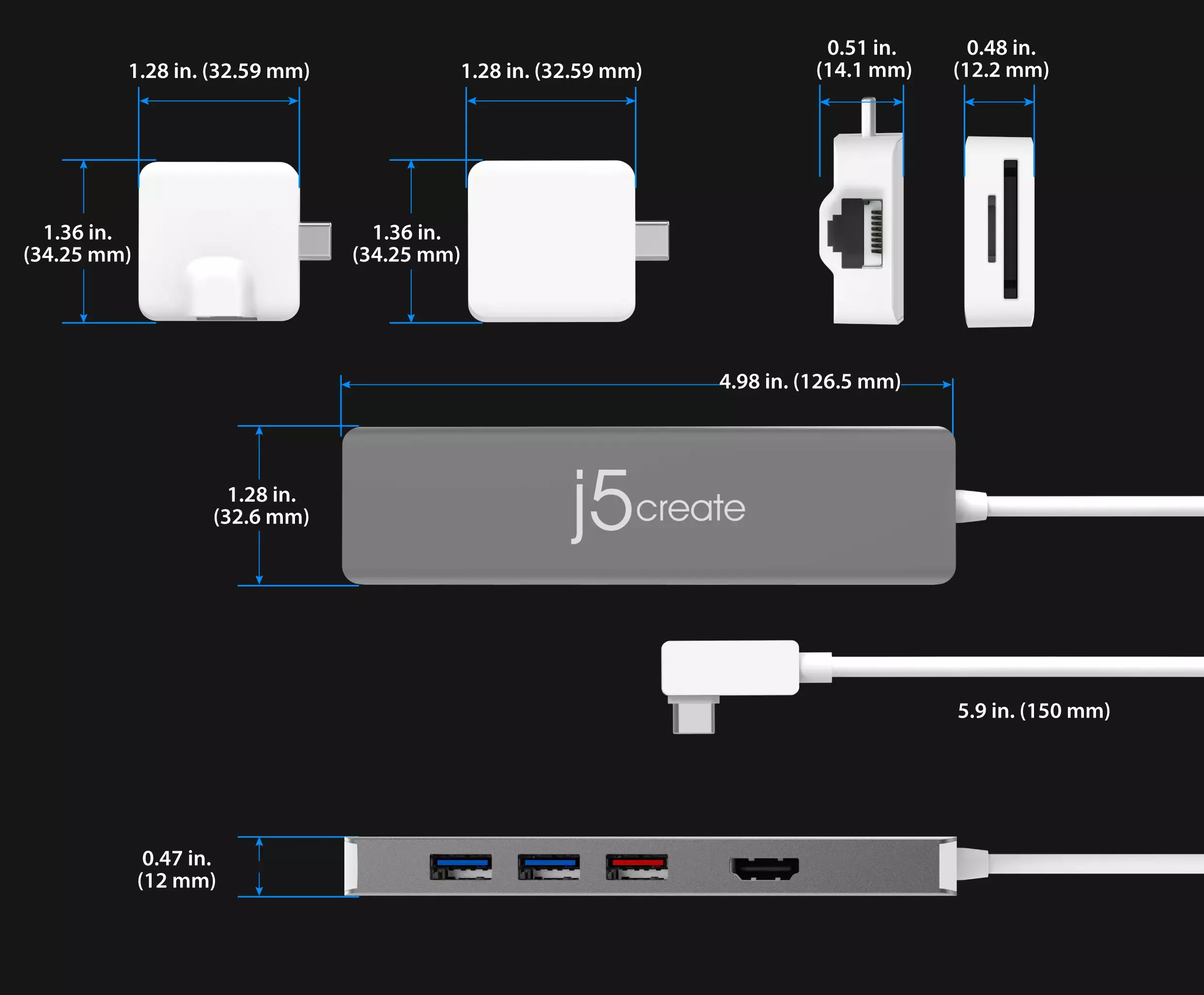 | Product Dimensions | Main Body: - 4.99 x 1.28 x 0.48 in. (126.5 x 32.6 x 12.2 mm) Kits: - Gigabit Ethernet: 34.25 x 32.59 x 14.10 mm - microSD™ & SD™ Card Reader: 34.25 x 32.58 x 12.20 mm |