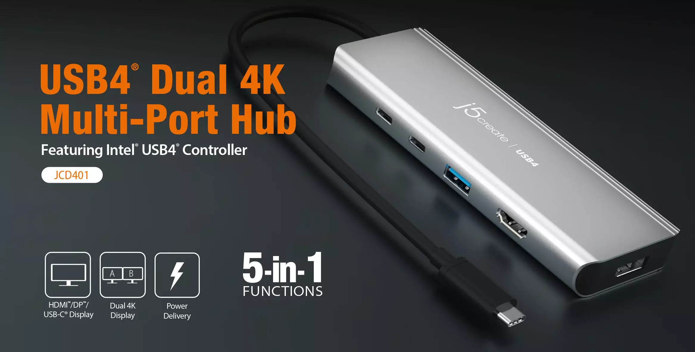 Hub j5create JCD401 USB4 Dual 4K Multi-port, 5 porturi, USB-C, 4K HDMI