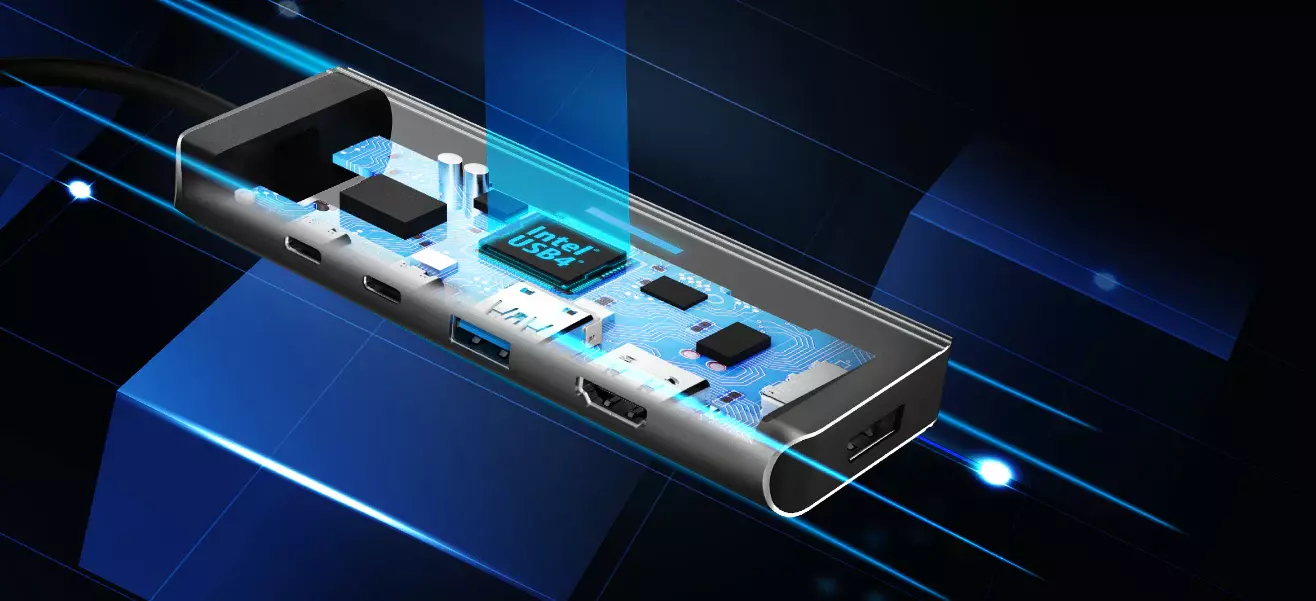 A high-performing USB4 multi-port hub and the first USB-C hub to incorporate the latest USB4 controller from Intel, compatible with Thunderbolt 3 and 4, and USB4