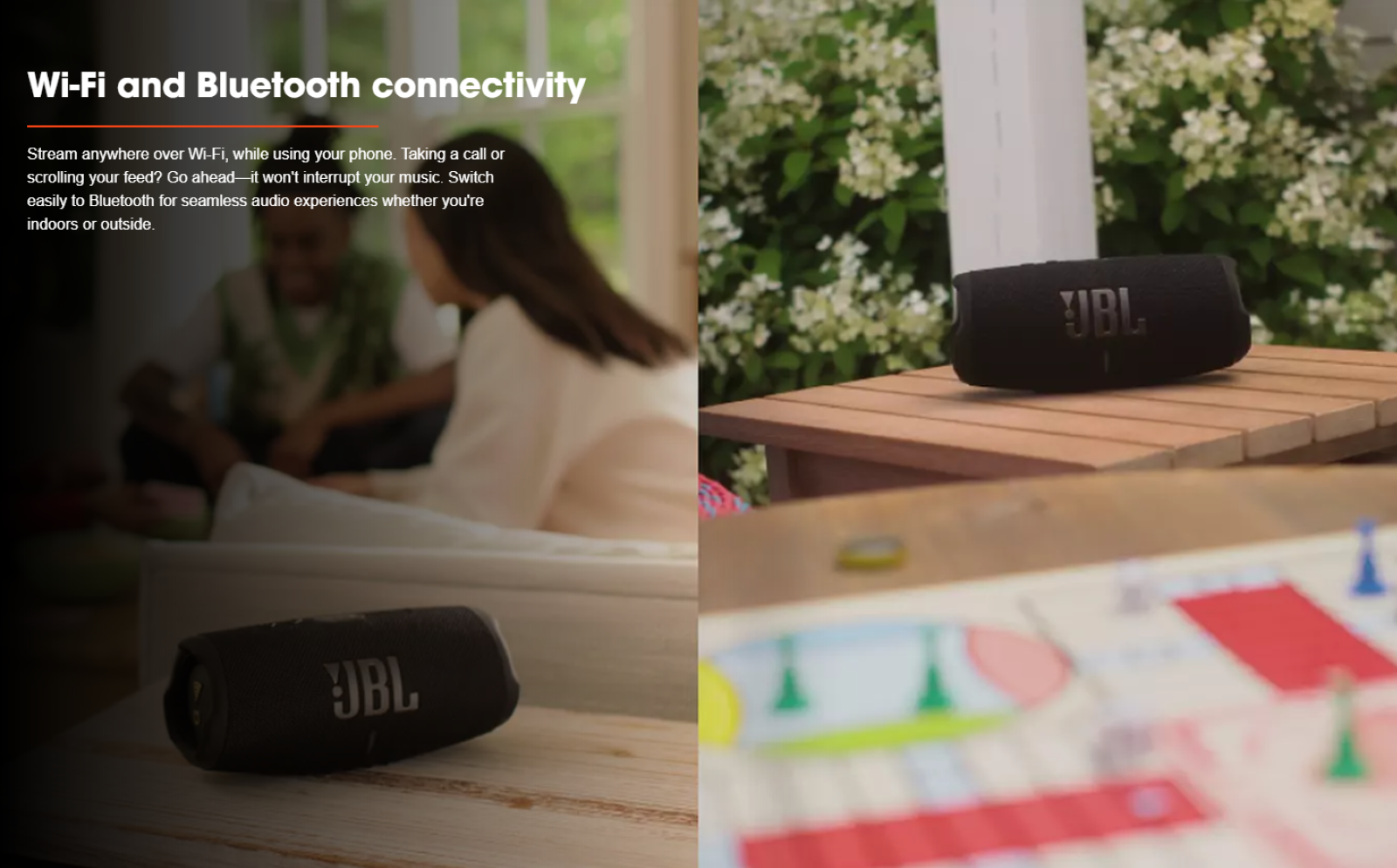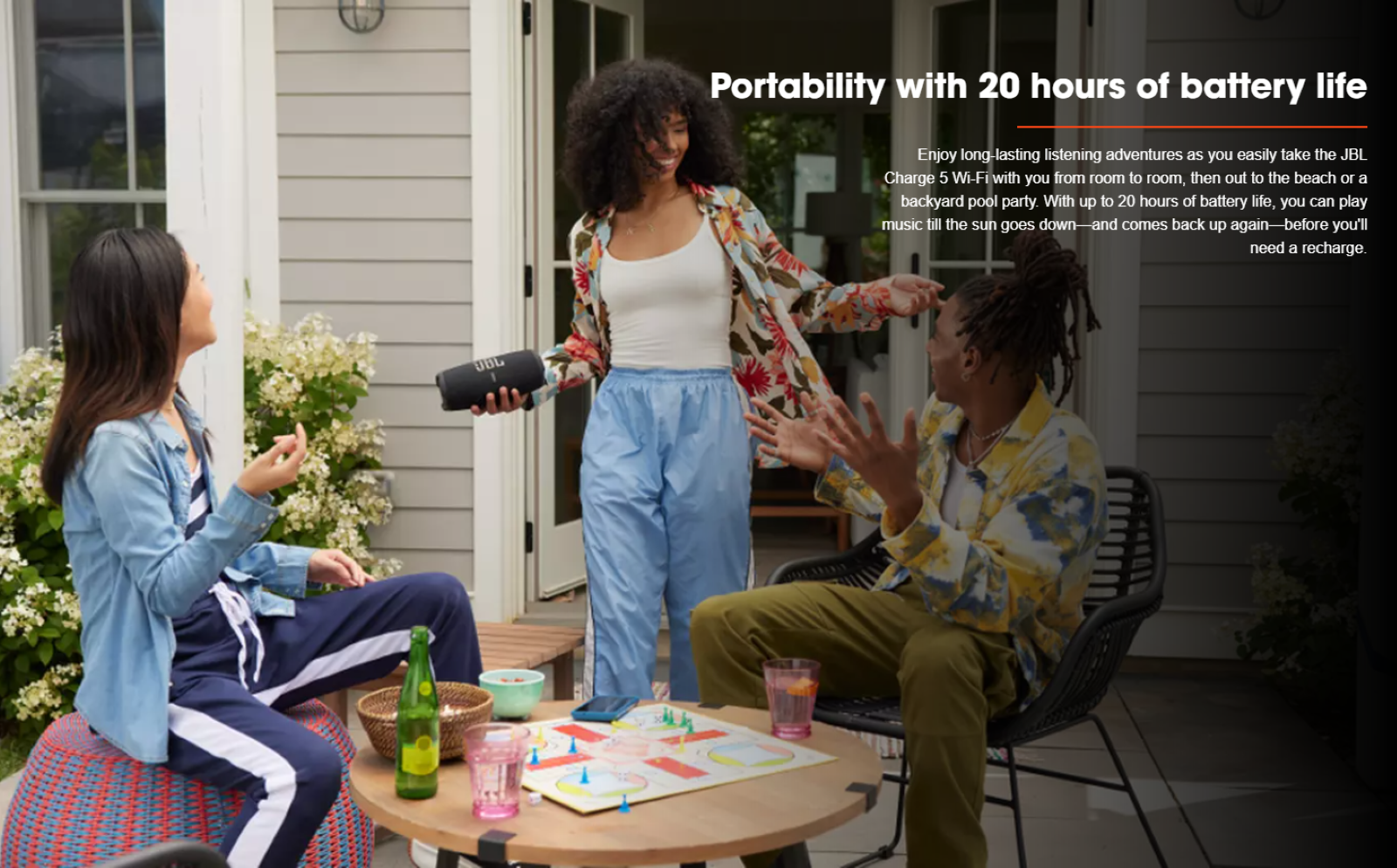 | Don't put the good times on pause. The JBL Charge 5 Wi-Fi's built-in powerbank lets you charge your devices without taking a break from the music. |