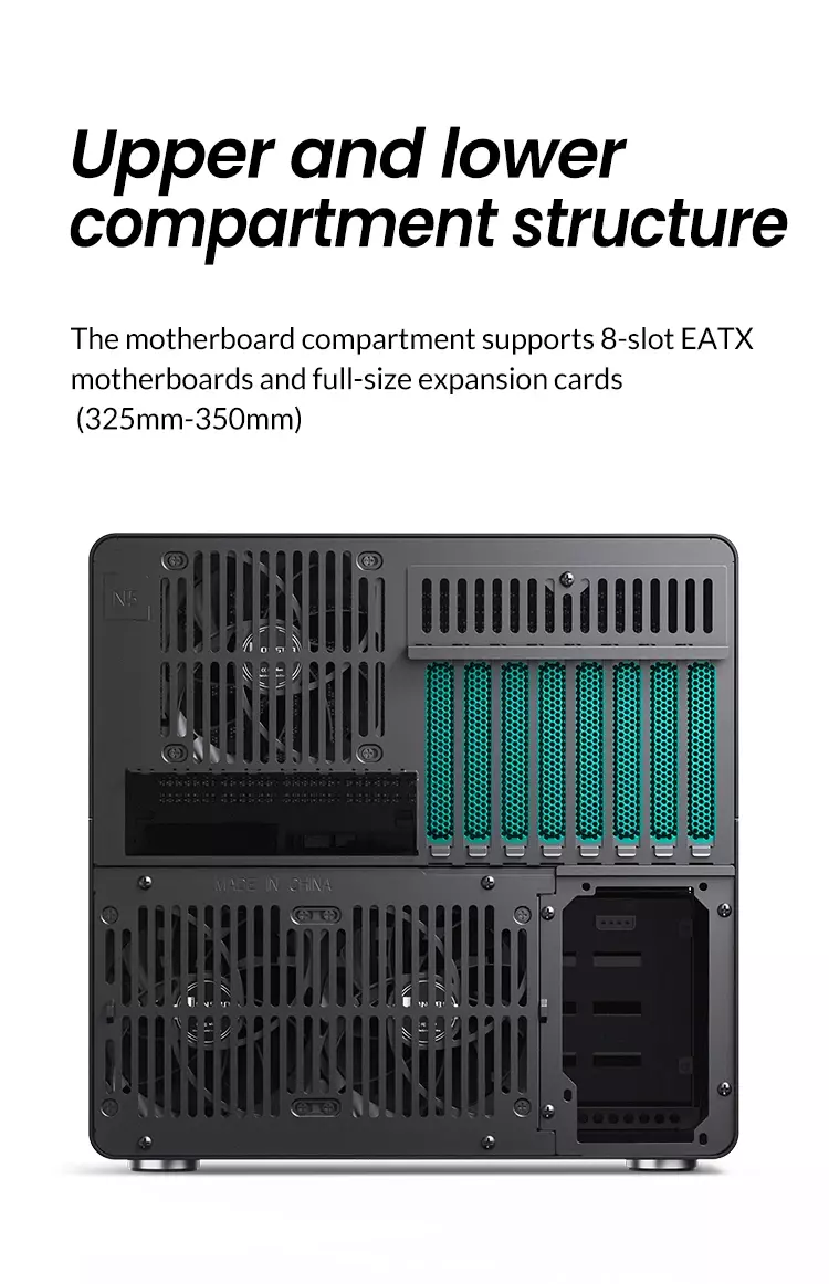 Jonsbo N5 NAS E-ATX este o carcasa premium conceputa special pentru servere NAS de acasa sau statii de lucru cu cerinte ridicate de stocare si racire.