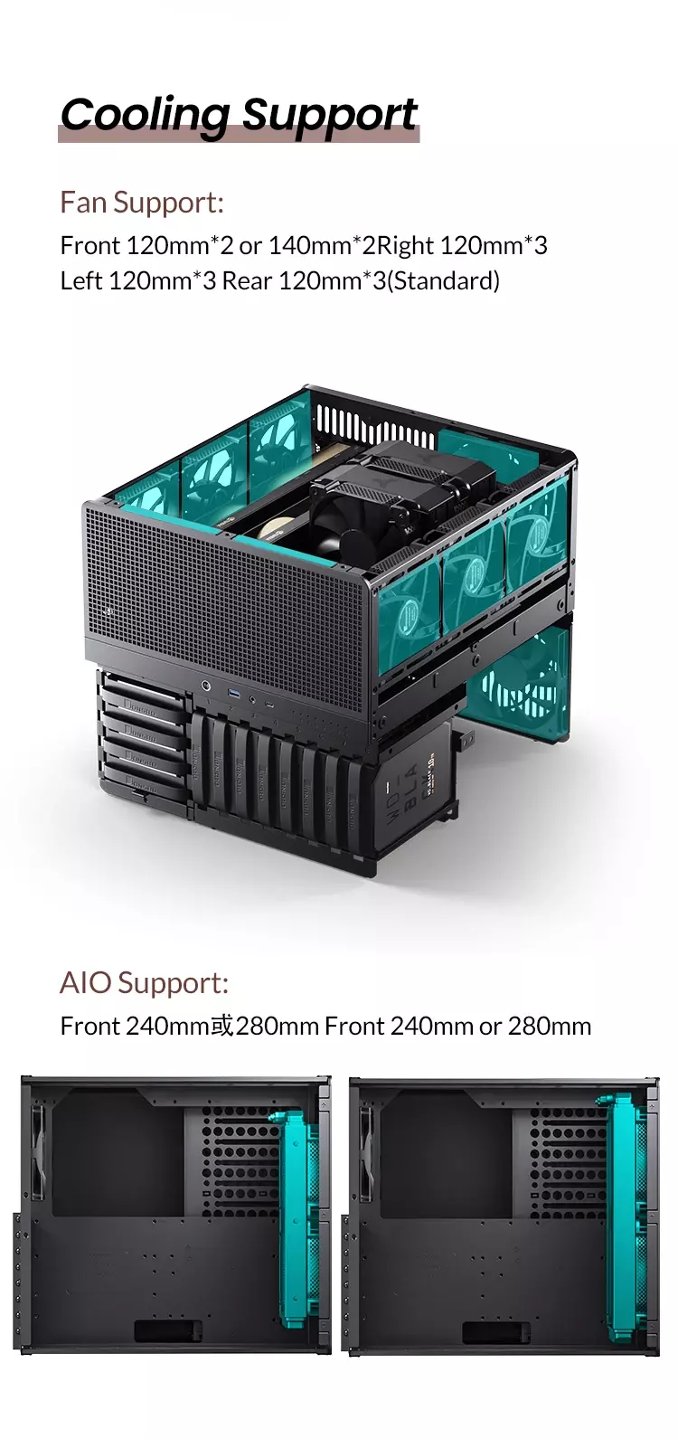 | Cooling System | Front 120mm*2 or 140mm*2 Left 120mm*3 Right 120mm*3 Rear 120mm*3 (built-in) |