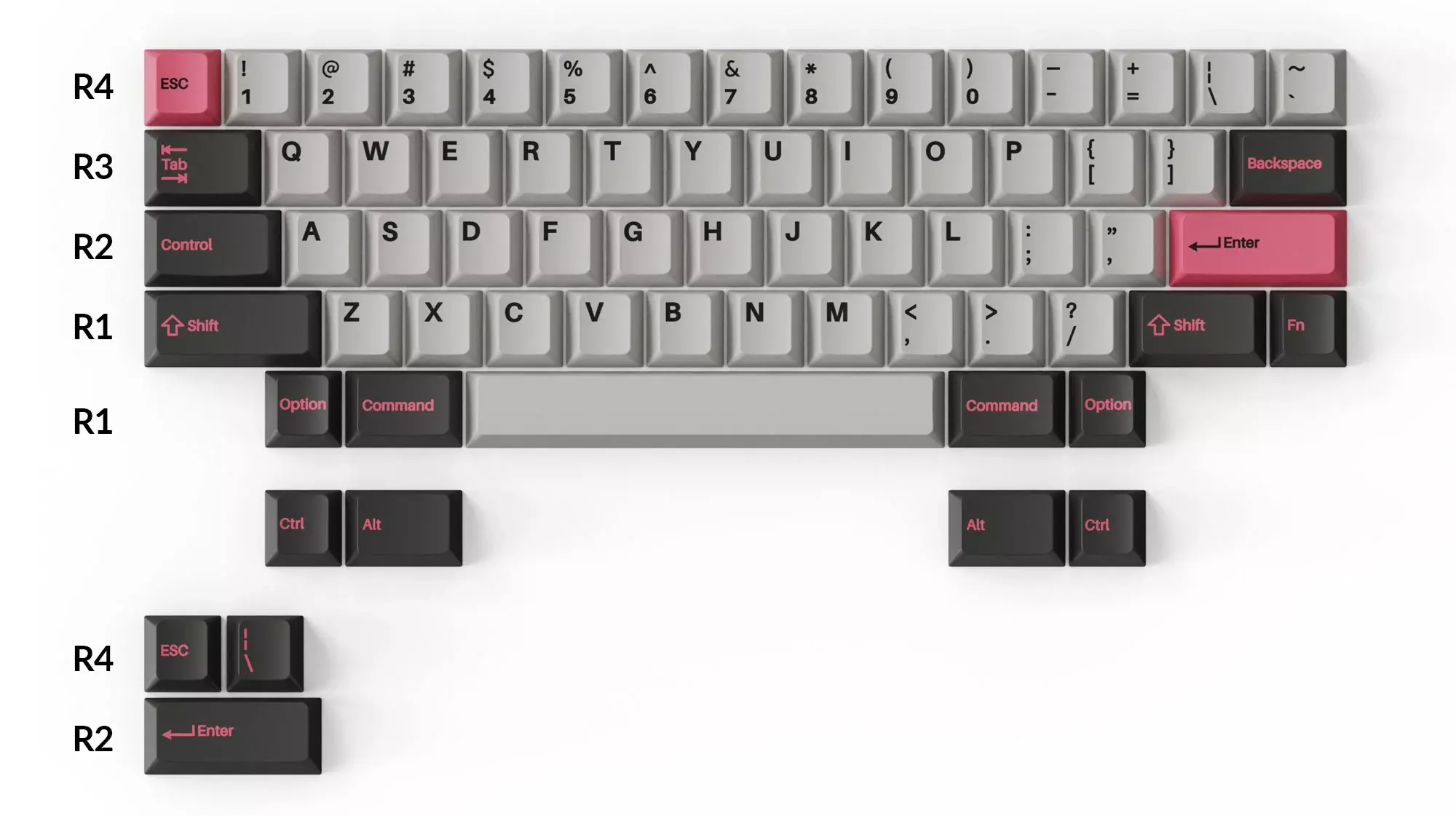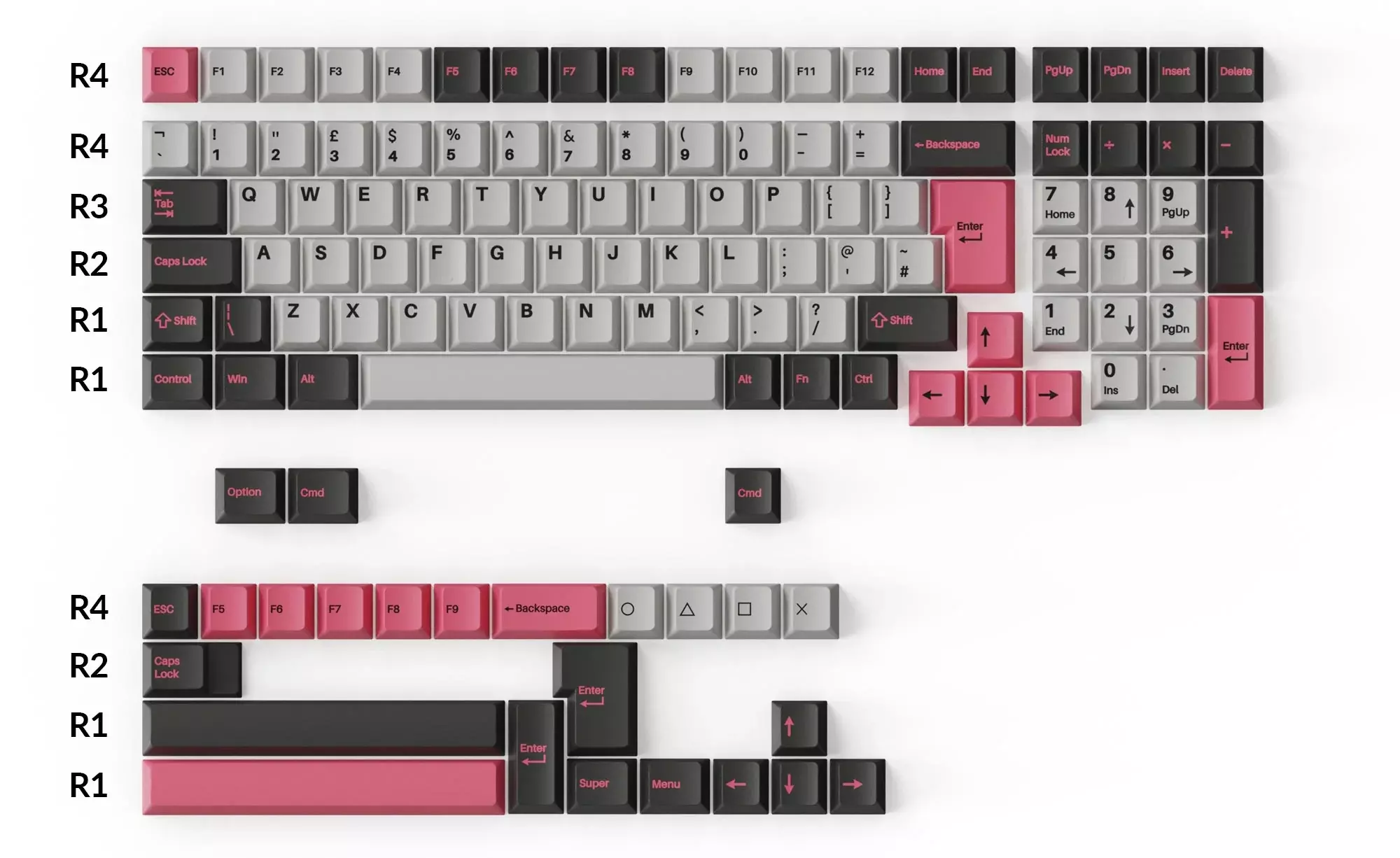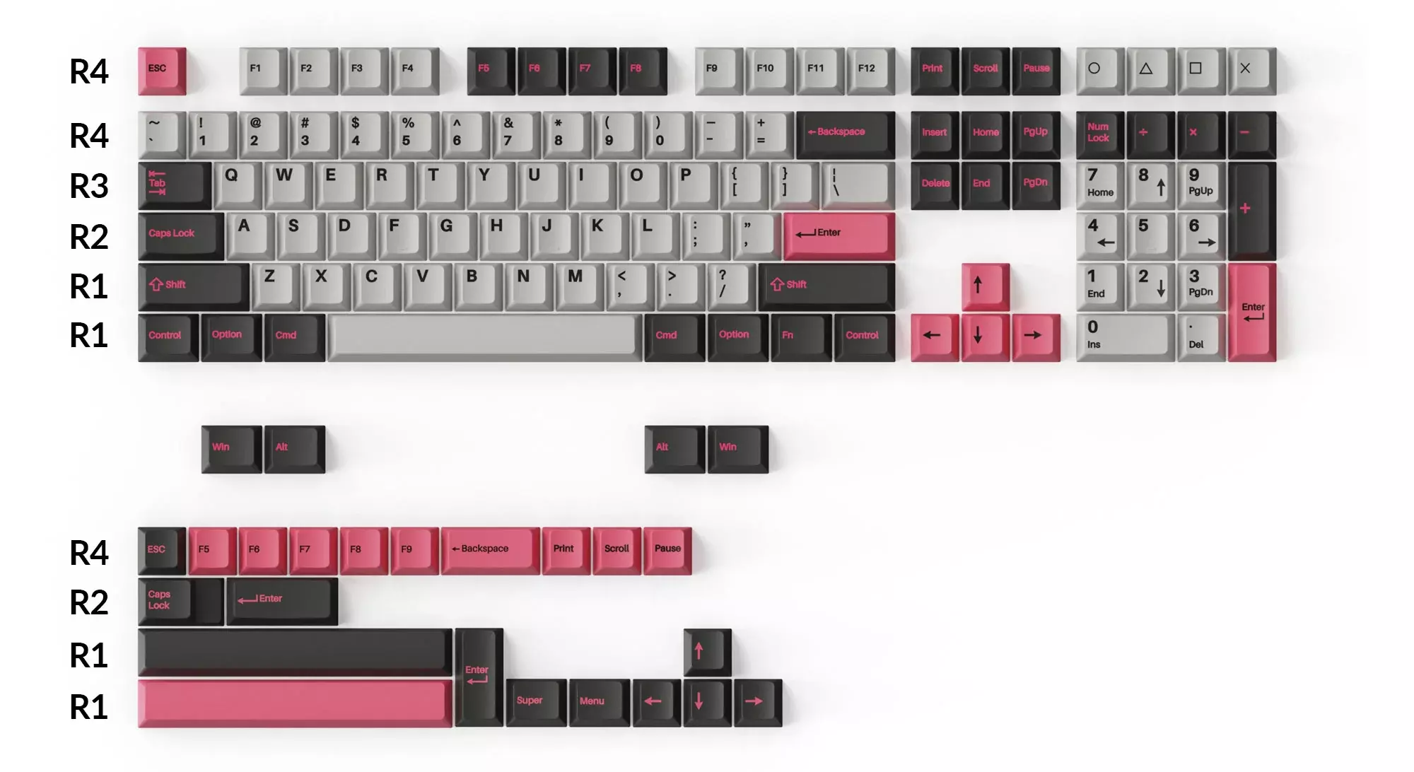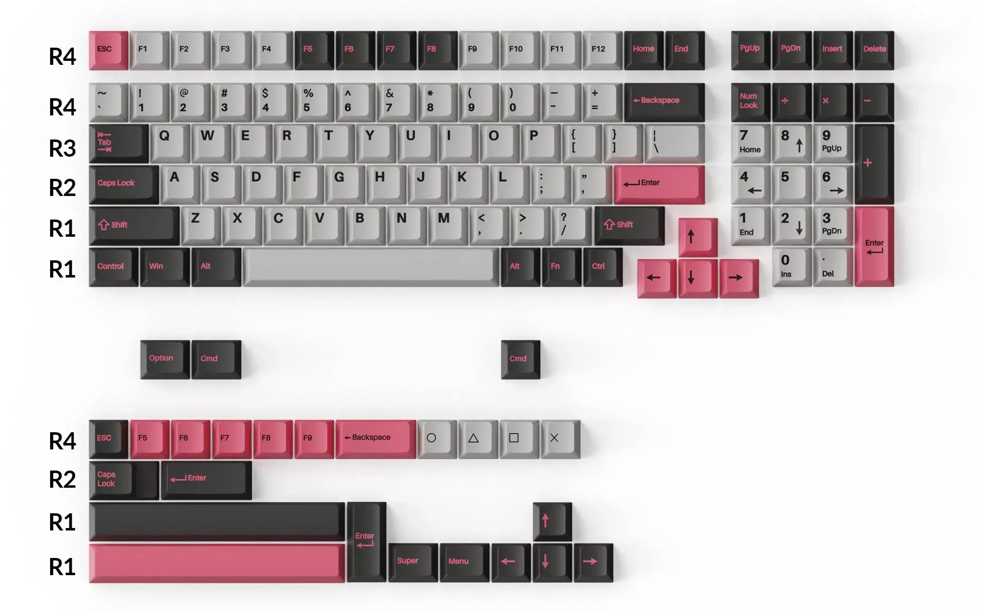*This keycap set does not include the M1, M2, M3, M4, and M5 keycaps. However, they have substitutes on the same row of this set, e.g.: you can replace the M1 key with Delete/End/PgDn on R4.