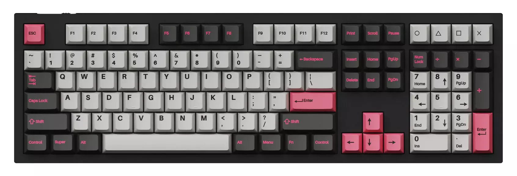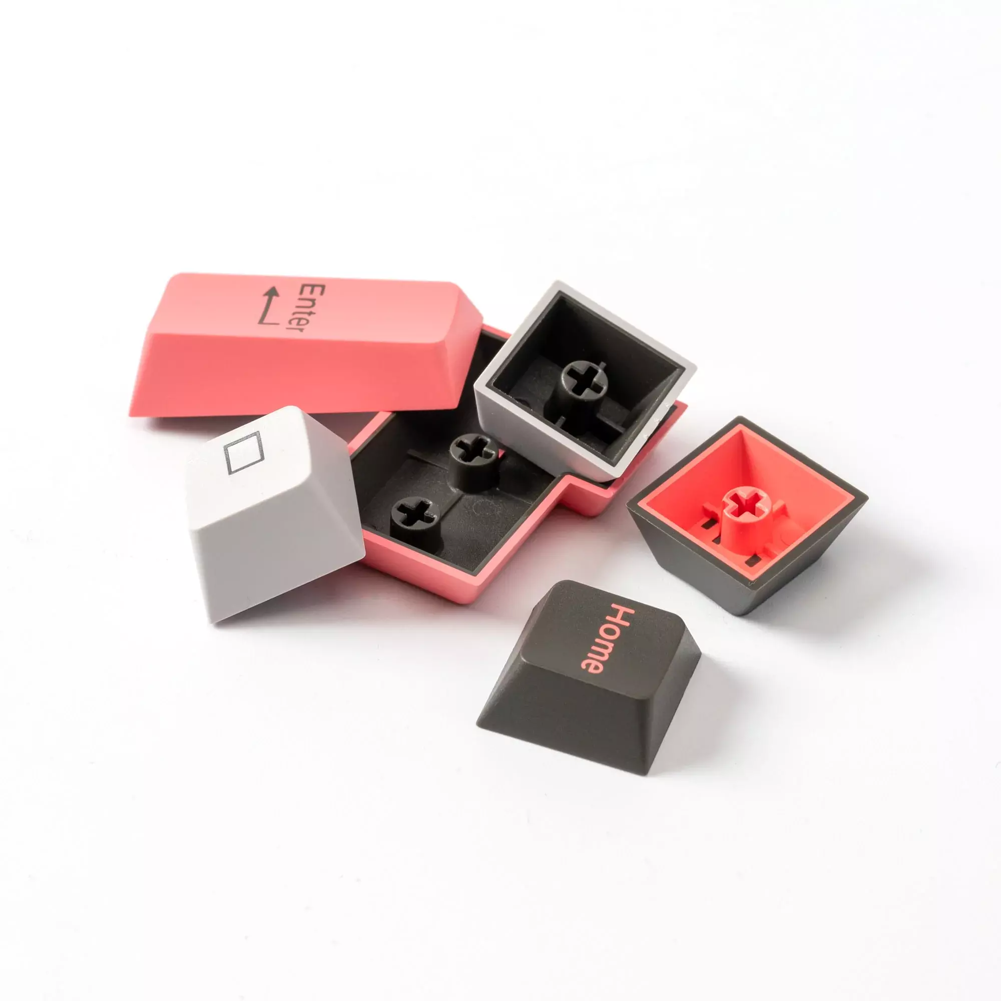 This grey and pink keycap set comes with double-shot legends that provides visual and physical typing comfort. It can be used for both gaming and typing purposes.