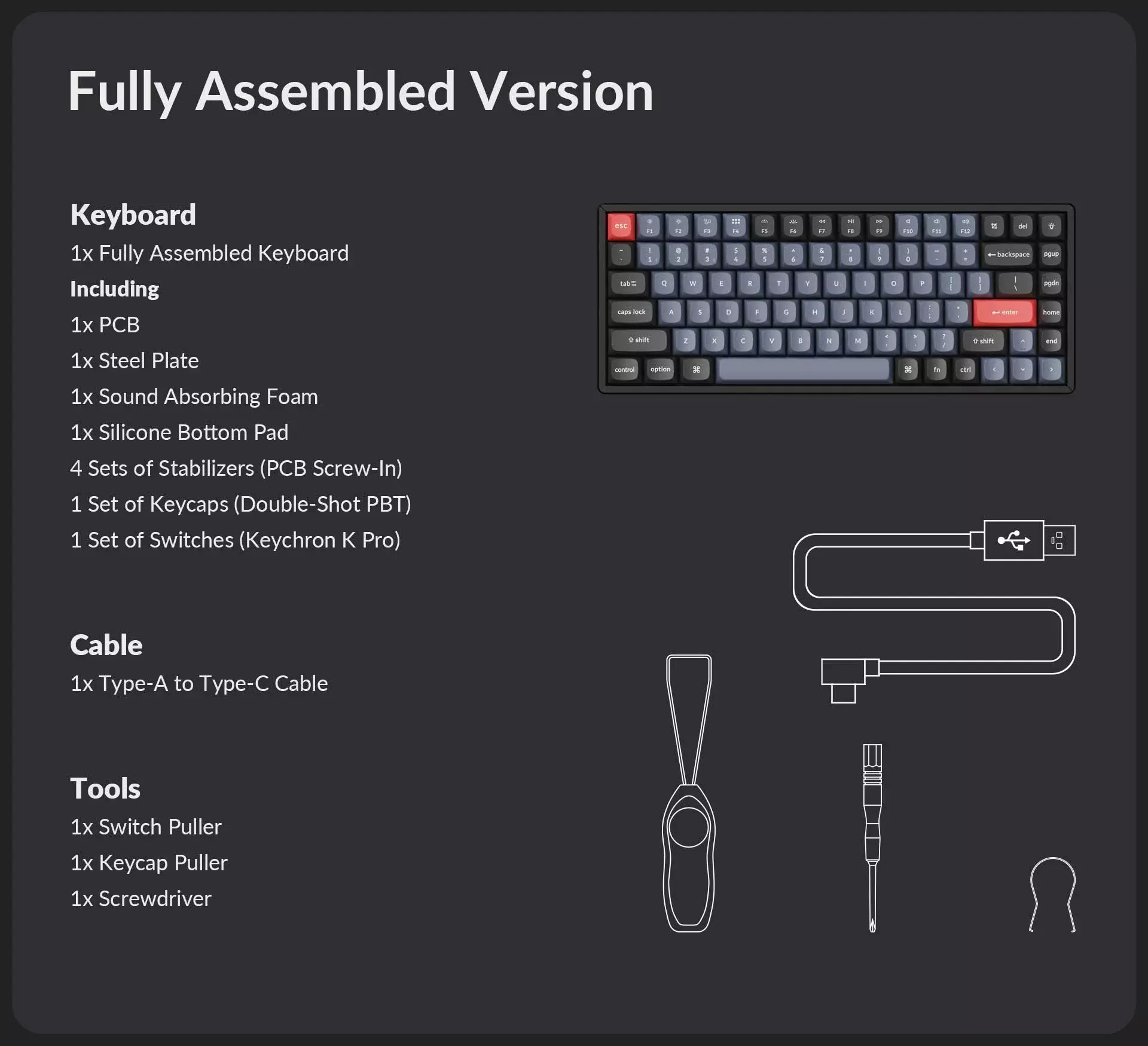 | Switches (Not including Barebone Version) | Keychron K Pro Mechanical | Connection | Bluetooth and Type-C cable |