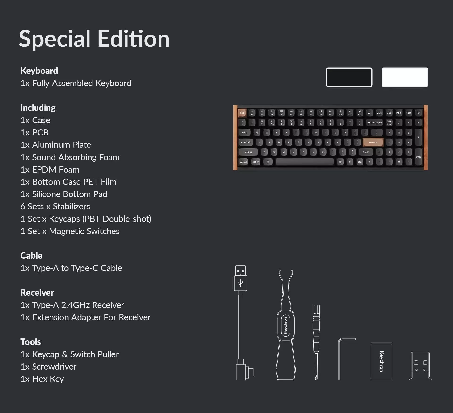 the black version. Both editions feature OSA profile double-shot PBT keycaps and aluminum with wooden frames.