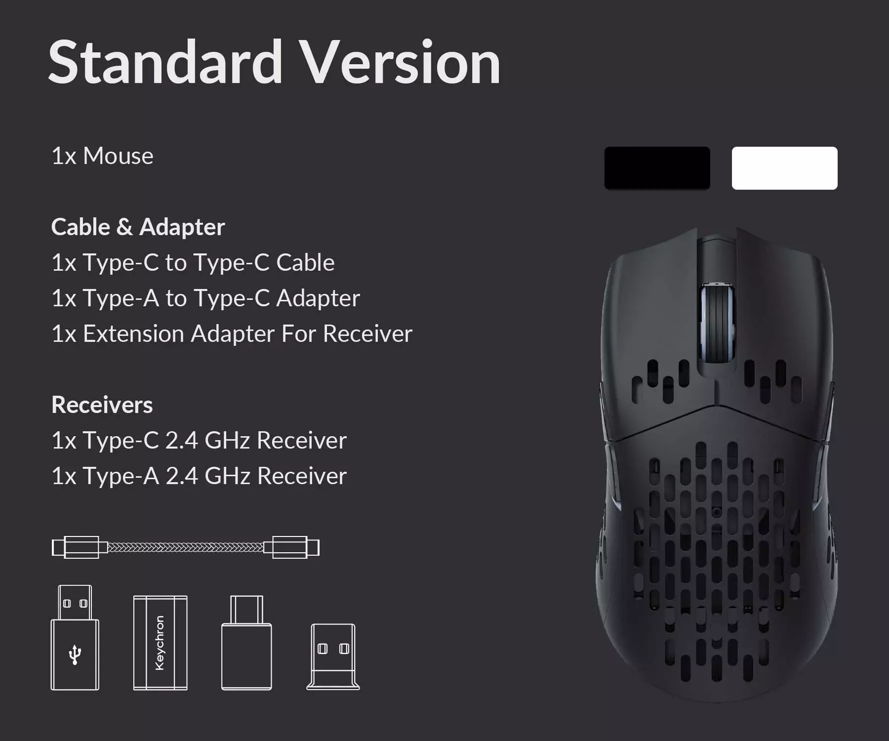 We designed the smallest Type-C 2.4 GHz receiver and a Type-A 2.4 GHz receiver for the mouse. You can pick either of them, plug it in, and play instantly.