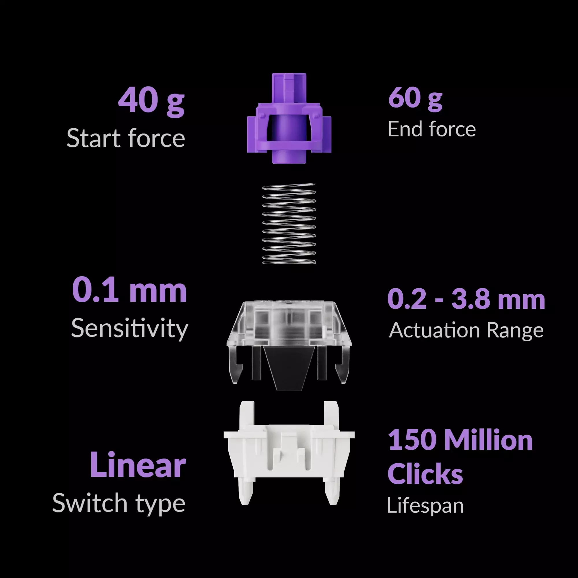 Switch-uri: Echipata cu switch-uri magnetice Gateron Double-Rail Hall Effect, care permit personalizarea punctului de activare (intre 0.5 si 3.8 mm) si atribuirea mai multor actiuni unei singure taste, in functie de adancimea apasarii.