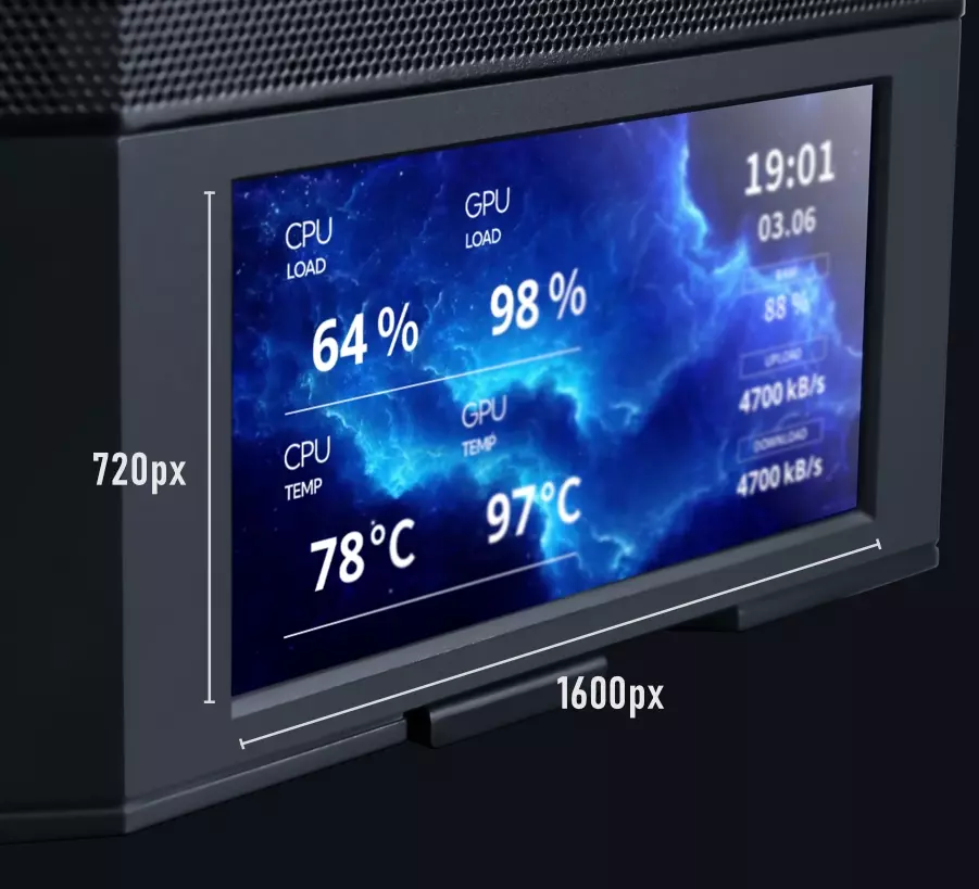 - Ecran LCD personalizabil: permite afisarea informatiilor hardware si poate fi utilizat ca ecran secundar de 60Hz.