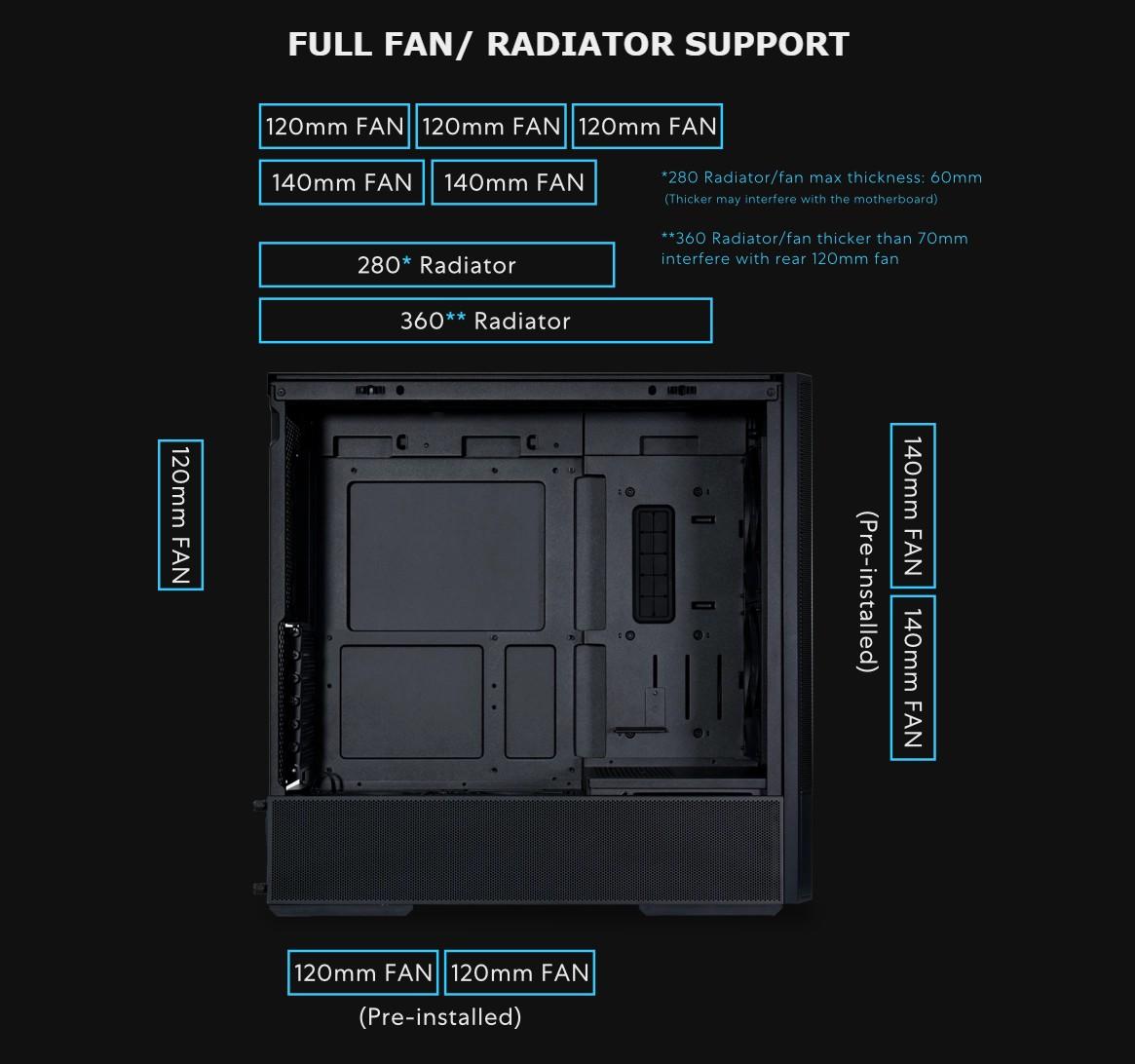 | FAN SUPPORT | Front: 140mm x 2 Top: 120mm x 3 or 140mm x 2 Above PSU Shroud: 120mm x 2 Rear: 120mm x 1 |