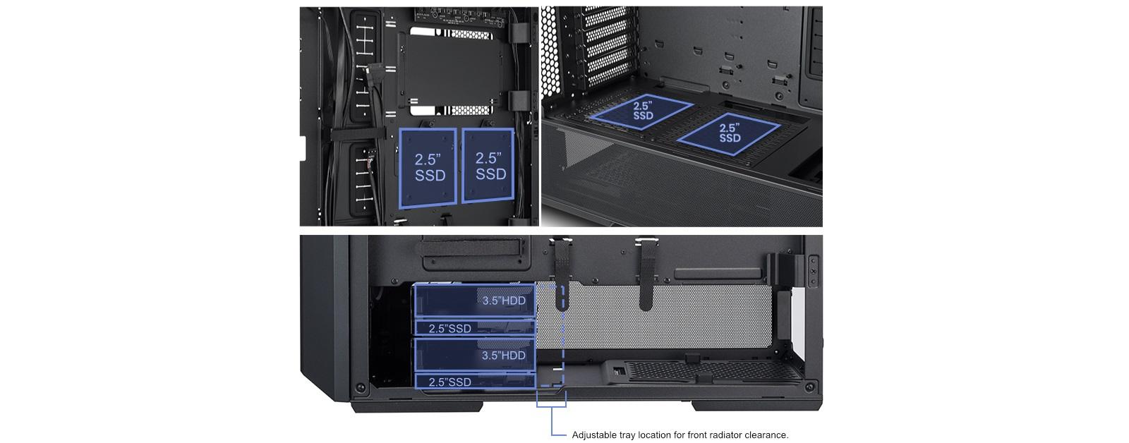 | COLOR | White | DRIVE | Drive Cage:2 x 2.5” SSD + 2 x 3.5” HDD PSU Cover:2 x 2.5” SSD Behind MB tray: 2 x 2.5” SSD |