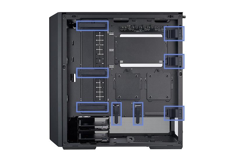 The LANCOOL 216 offers multiple options for easy cable management. Along the cable grommet bar, 3 large velcro straps can hold