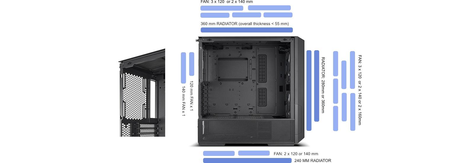 | FAN SUPPORT | Top: 3 x 120mm / 2 x 140mm PSU Cover: 2 x 120mm / 2 x 140mm (Air Cooling mode) Front: 3 x 120mm / 2 x 140mm / 2 x 160mm Rear: 1 x 120mm / 1 x 140mm (Not compatible with UNI FAN SL-INF 140) PCIe Fan Bracket: 1 x 120mm |