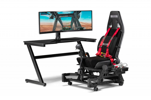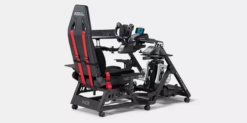 A Flight Seat that is suited for a wide range of aviation users. The Next Level Racing Flight Seat Pro Features a wide frame design for extra stability and a center HOTAS mounting pole with height and angle adjustment, making it compatible with major brands, including Thrustmaster, VIRPIL, WINWING, and more. For added comfort and immersion during long flight sessions, the Flight Seat Pro includes a safety footstep, lumbar cushion, and seat harness, with a variety of flight plates that are compatible with a wide range of throttles and HOTAS peripherals on the market. With an ergonomically designed flight seat and support for helicopter and space setups, the Flight Seat Pro is the perfect choice for pilots of all levels. Plus, with included lockable castor wheels, the cockpit can be easily transported to different locations, making it the ultimate choice for professionals and enthusiasts alike. Flight users can place their Flight Seat Pro in front of their desk to achieve a genuinely immersive experience. Combine the Flight Seat Pro with the Next Level Racing Flight Stand Pro to create the most versatile flight cockpit on the market for the most immersive flight experience. For a more immersive experience, the Flight Stand Pro is also compatible with Next Level Racing Motion Plus Platform and Motion Platform V3.