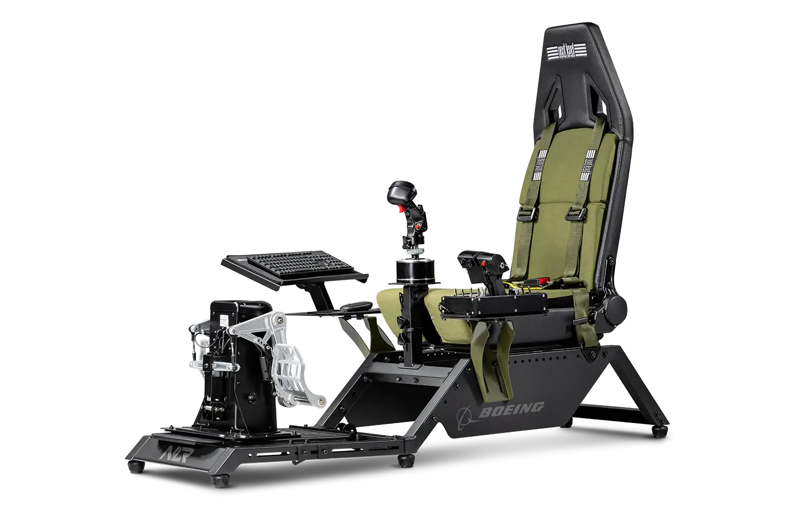 Takes it to the skies with the Next Level Racing Flight Simulator Boeing Military Edition, our first flight dedicated cockpit designed specifically for the aviation community in collaboration with The Boeing Company. Branded in Boeing components like the military inspired green canvas seat covering and Military Green highlights, the Boeing community can now interact with a flight a cockpit that is inspired by a military Boeing flight cockpit. The Next Level Racing Flight Boeing Military Edition Cockpit offers a wide range of configurations to suit different class of flight, including Combat, Space, Commercial, and General Aviation. The Flight Simulator Boeing Military Edition Cockpit is compatible with a wide range of electronics such as yokes, joysticks, and throttles for all major brands. Staying true to the military cockpit, the joystick can be directly attached between the user’s legs for an authentic combat flight experience. With a growing ecosystem of flight accessories by Next Level Racing, the flight community can expect a solution that is suited for flight simulation. The Next Level Racing Flight Simulator Boeing Military Cockpit is designed to be compatible with the Thrustmaster TCA Yoke Pack Boeing Edition directly mounted to the cockpit with a true positioning of the peripheral for the most realistic flight simulation experience.