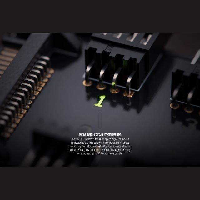 RPM and status monitoringThe NA-FH1 transmits the RPM speed signal of the fan connected to the first port to the motherboard for speed monitoring. For additional watchdog functionality, all ports feature status LEDs that light up if an RPM signal is being received and go off if the fan stops or fails.